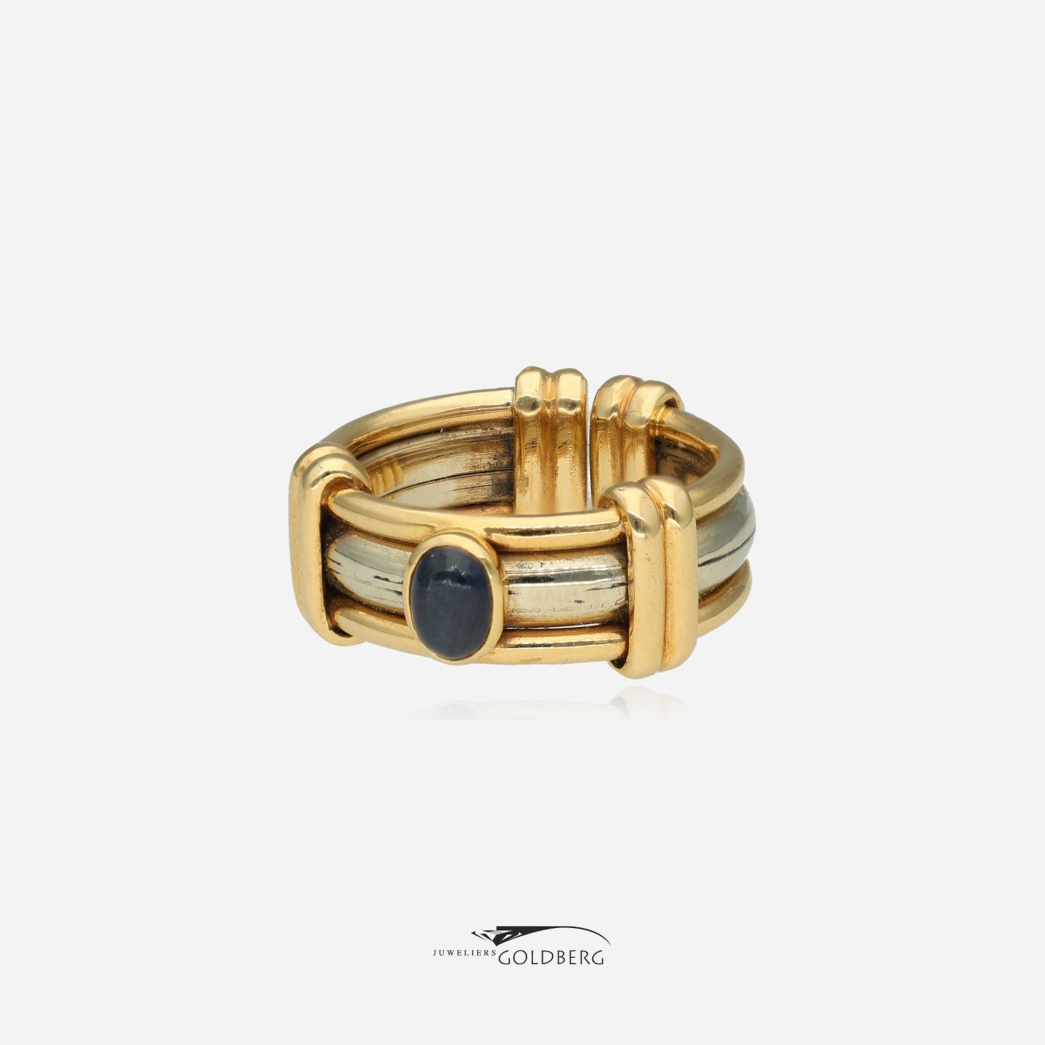 A beautiful 14k two-tone gold vintage squeeze ring with a cabochon-cut blue sapphire.