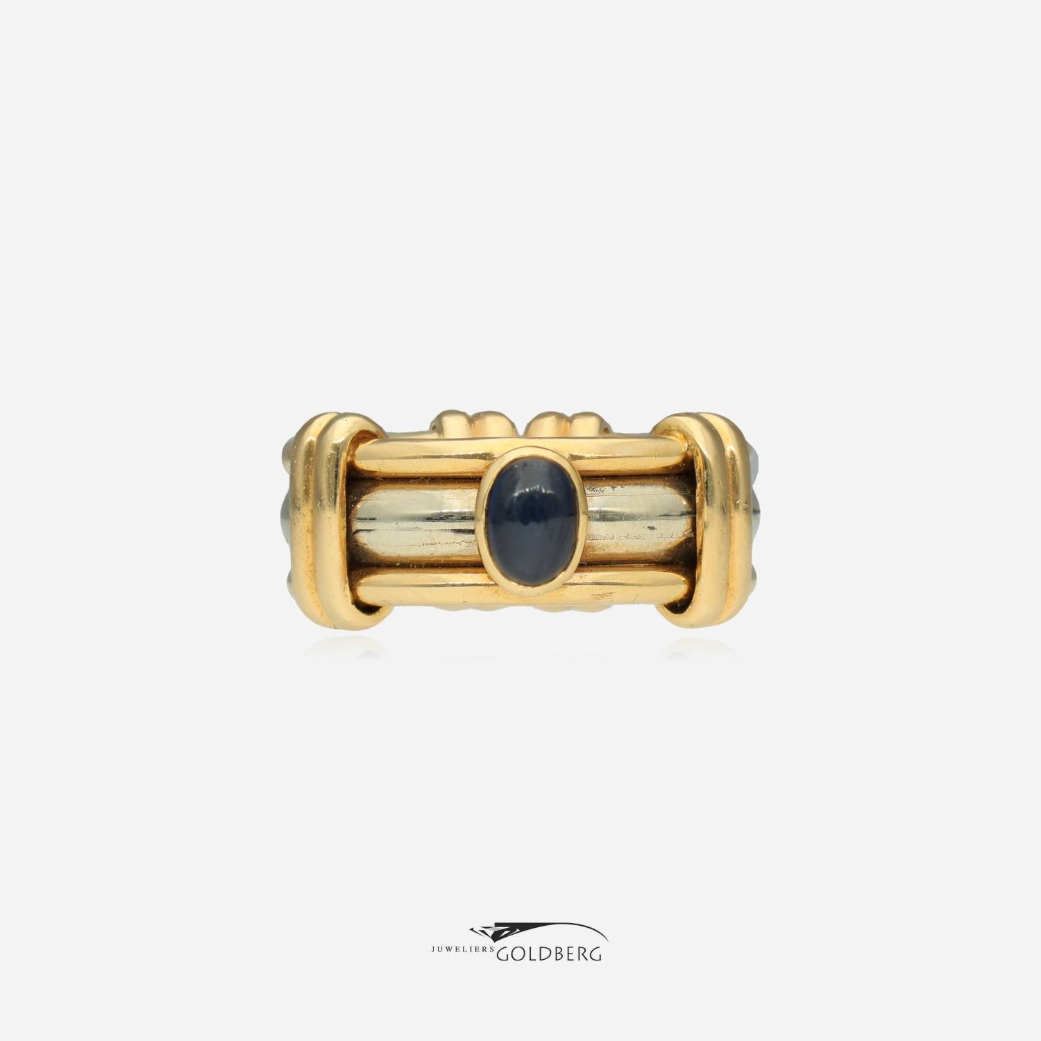 The warm two-tone gold tones create a beautiful contrast with the deep blue sapphire, while the cabochon cut creates a soft and elegant look. This ring is over 10 mm wide.