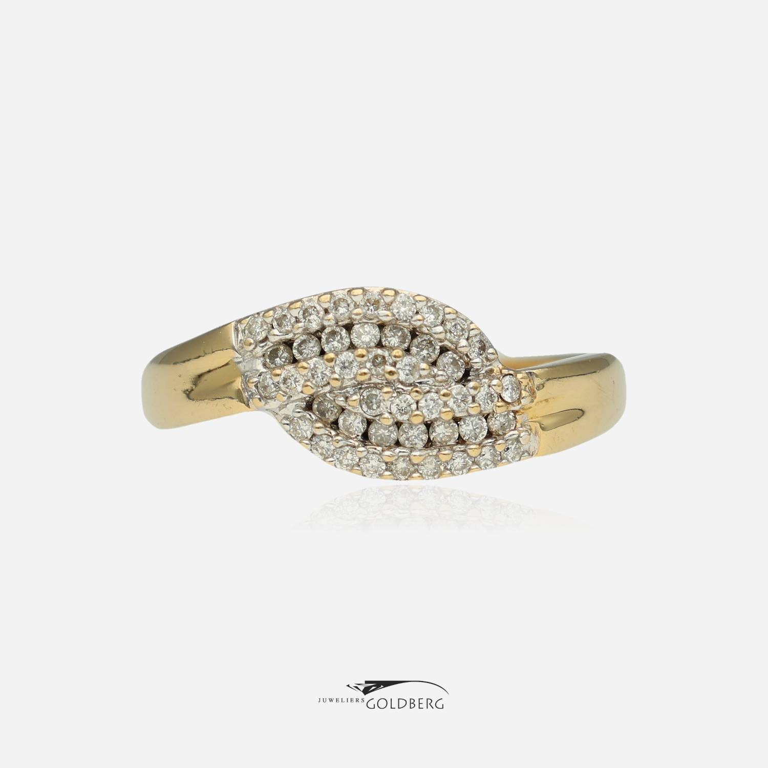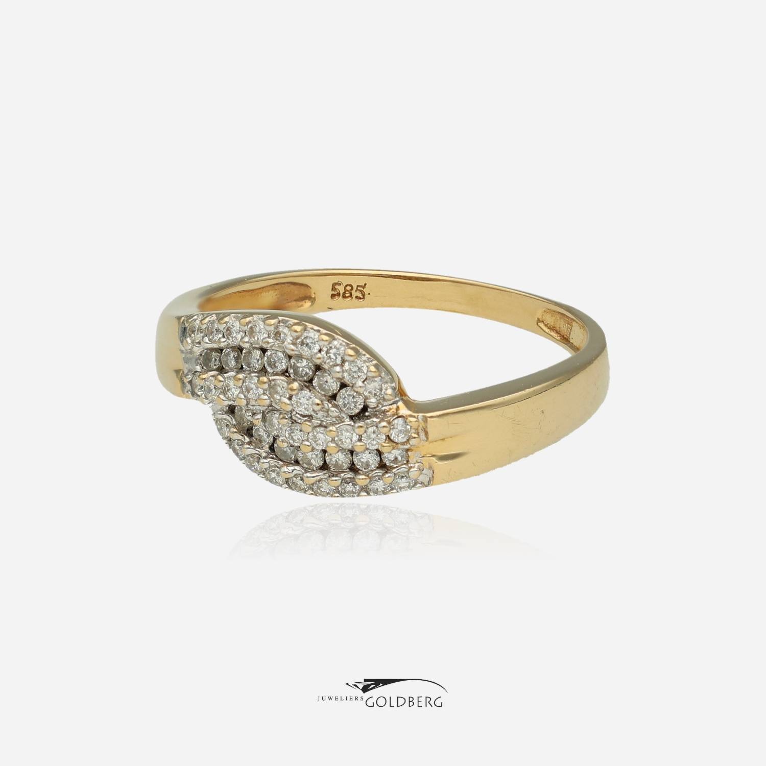 A beautiful 14k gold vintage ring with 44 brilliant-cut diamonds. The diamonds have a combined weight of approximately 0.35 ct. This unique, patterned ring resembles a ring, but instead of the band encircling a single stone, it extends into two sets of three rows of diamonds. The ring is approximately 8.1 mm wide at the top and approximately 1.7 mm wide at the bottom. Interested? Feel free to visit us or contact us to discuss the possibilities!