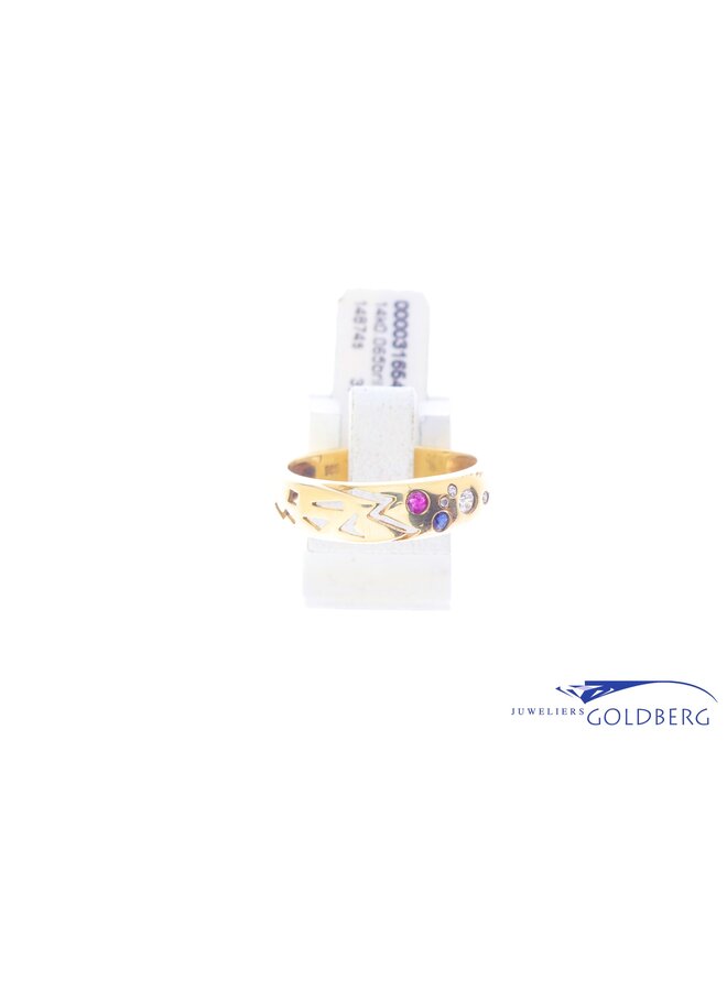 A beautiful wide gold ring with four brilliant cut diamonds with a total weight of 0.065ct, one round cut sapphire of approx. 1.6mm and one round cut ruby of approx. 1.8mm. The playful design of the geometric shapes in collaboration with the combination of gemstones is what makes this fantasy ring unique. This ring has a width of approx. 5.9 mm at the top and a bandwidth of approx. 3.9 mm at the bottom. The ring can be resized to the correct size.