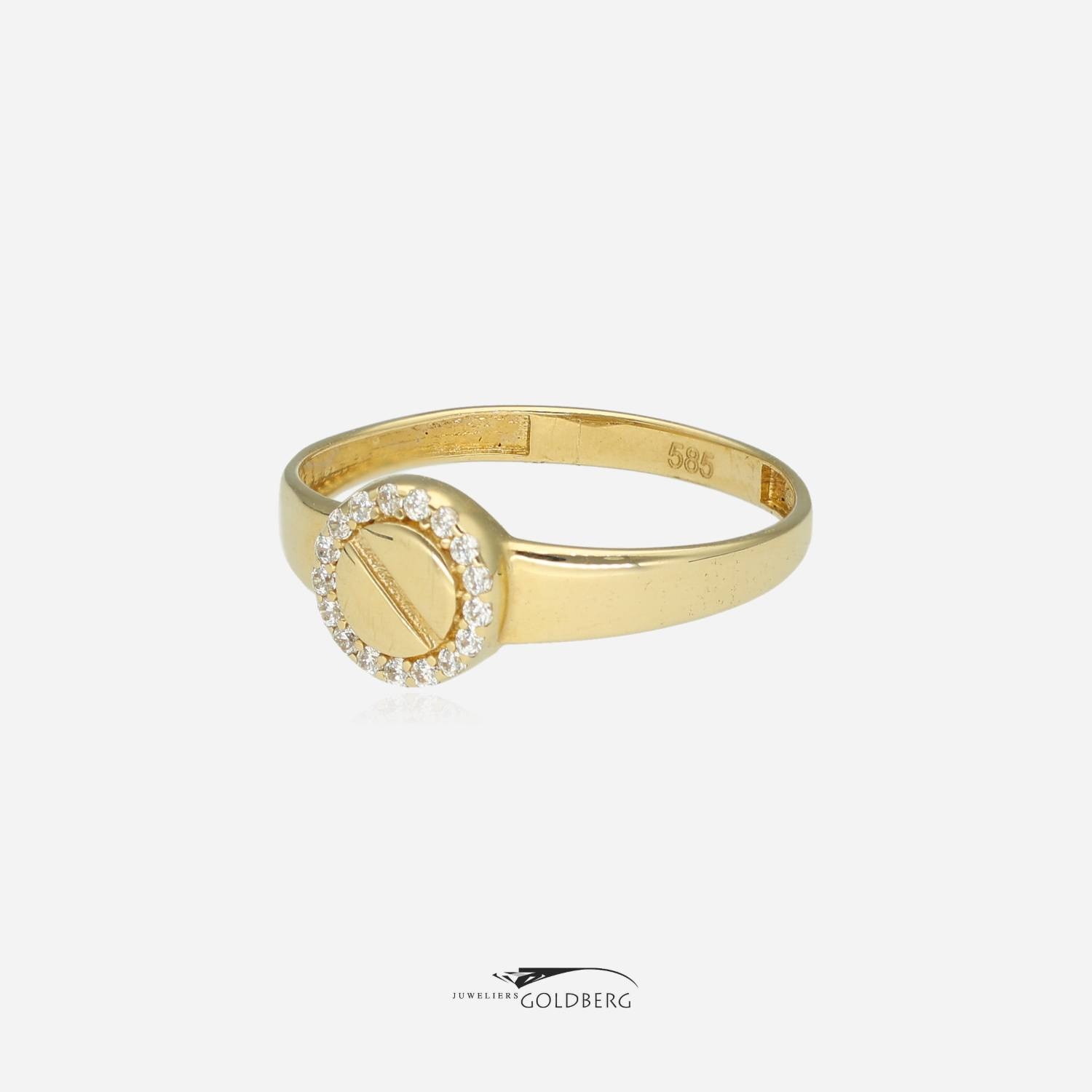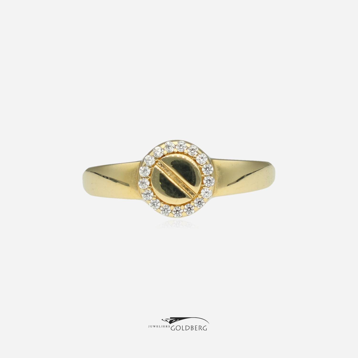 A beautiful vintage ring in 14k yellow gold, set with 17 brilliant-cut cubic zirconia. As shown in the images, the design is inspired by the shape of a screw head, subtly reminiscent of Cartier's style. The ring combines classic elegance with a contemporary, refined finish. The ring is approximately 7.7 mm wide at the top and 2.1 mm at the bottom. Interested? Feel free to visit us or contact us to discuss the possibilities!