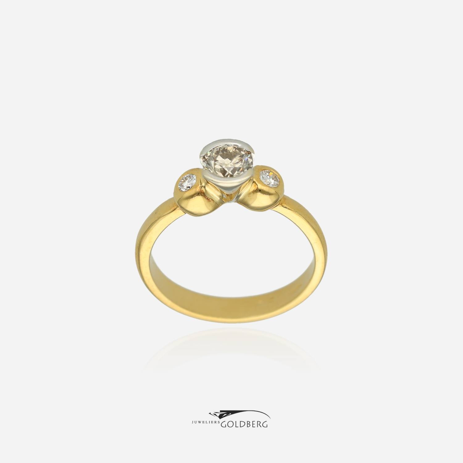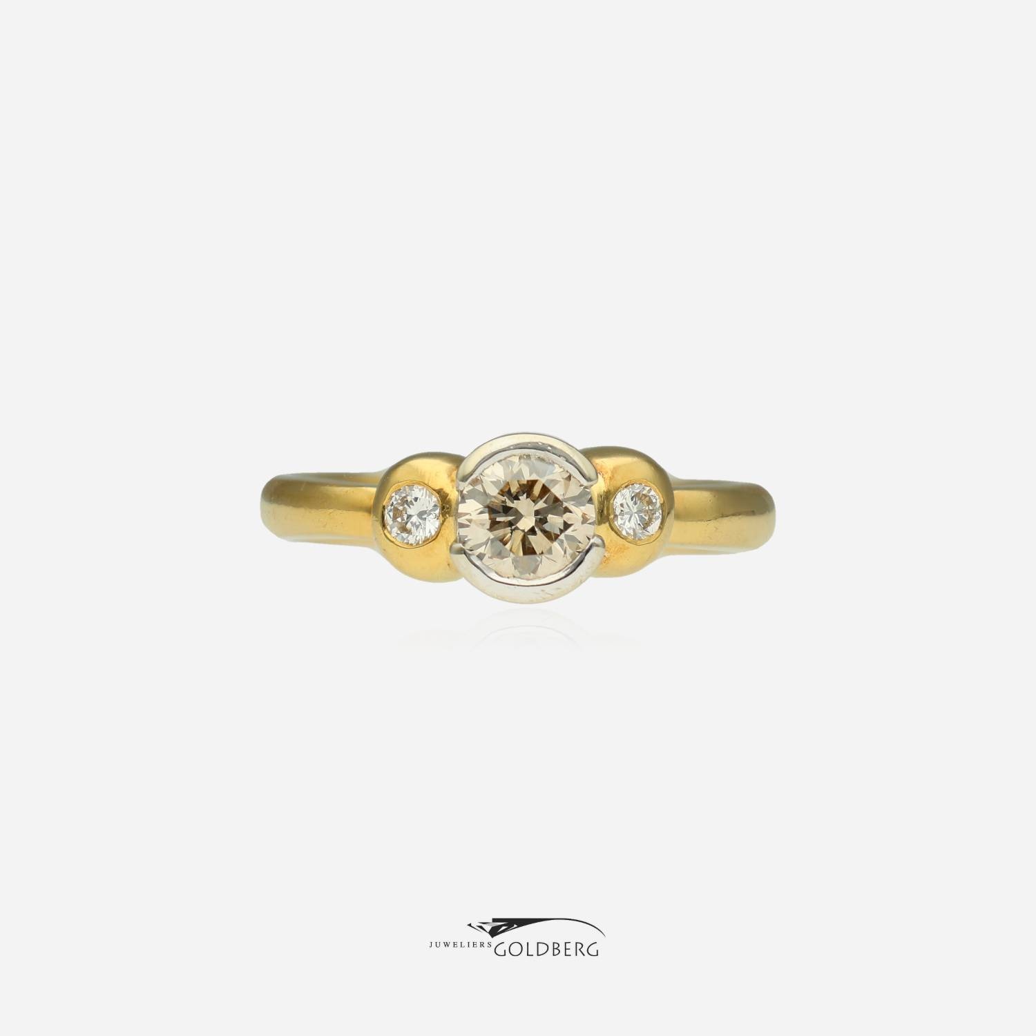 A beautiful 18k gold vintage ring with three brilliant-cut diamonds. The center stone weighs approximately 0.50 ct, and the side stones weigh approximately 0.05 ct each, for a combined weight of approximately 0.60 ct. The large center stone in the white gold setting gives this piece a unique look! This ring is approximately 6.5 mm wide at the top and 2.8 mm at the bottom. Interested? Feel free to visit us or contact us to discuss the possibilities!