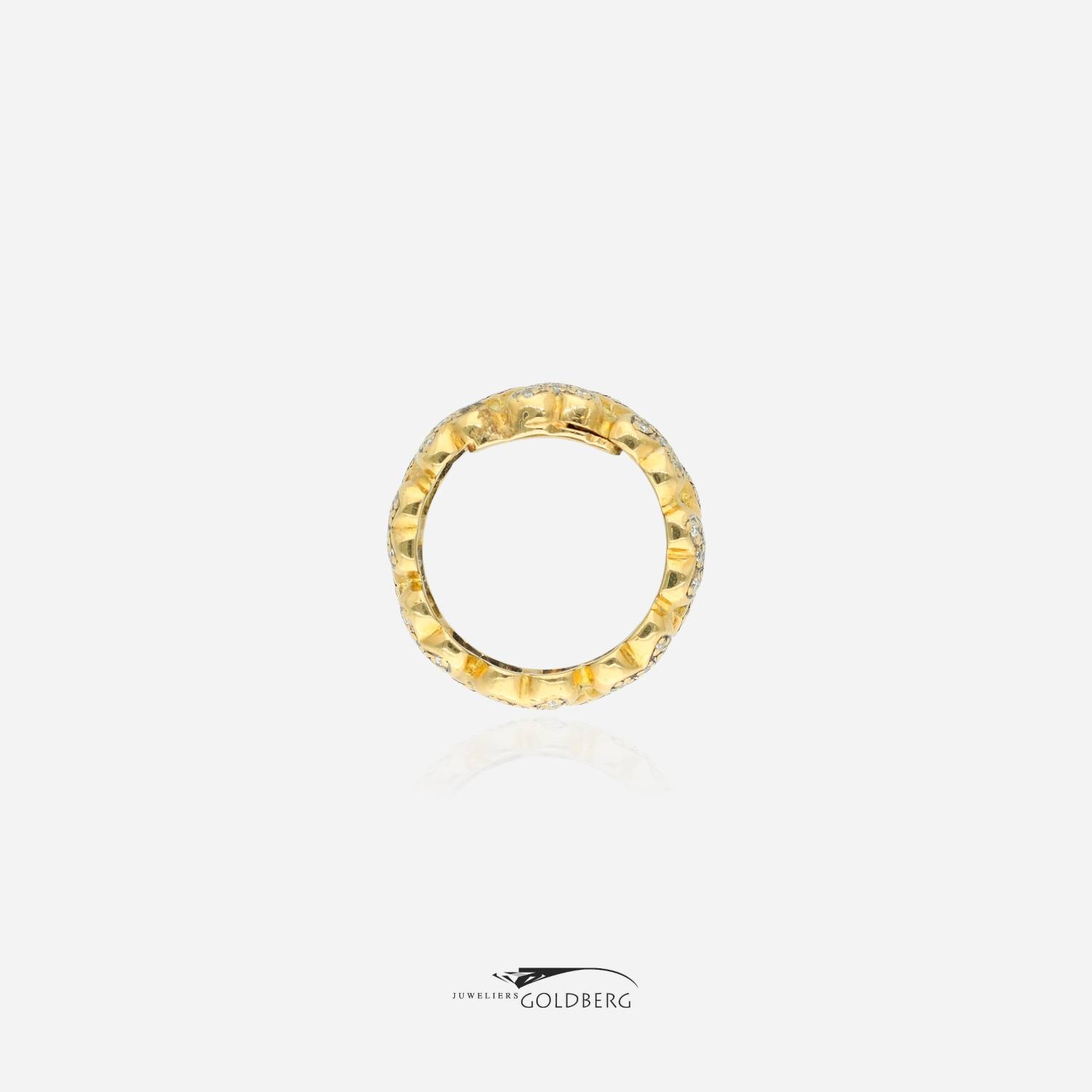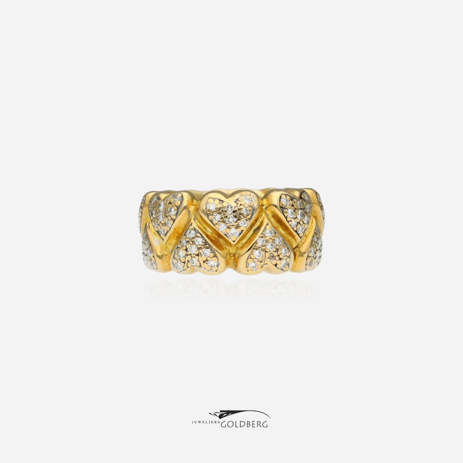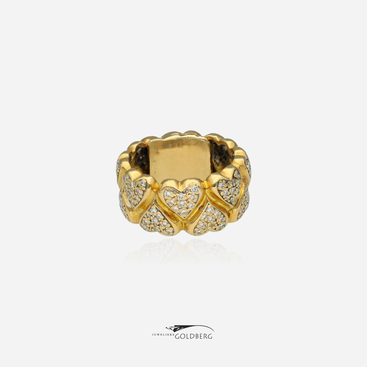This beautiful 18k gold vintage ring is set with an impressive 144 brilliant-cut diamonds. As shown in the images, the diamonds are set in sets of nine in heart-shaped ornaments, creating a unique and playful look. The ring is approximately 9.5 mm wide. Interested? Feel free to visit us or contact us to discuss the possibilities!