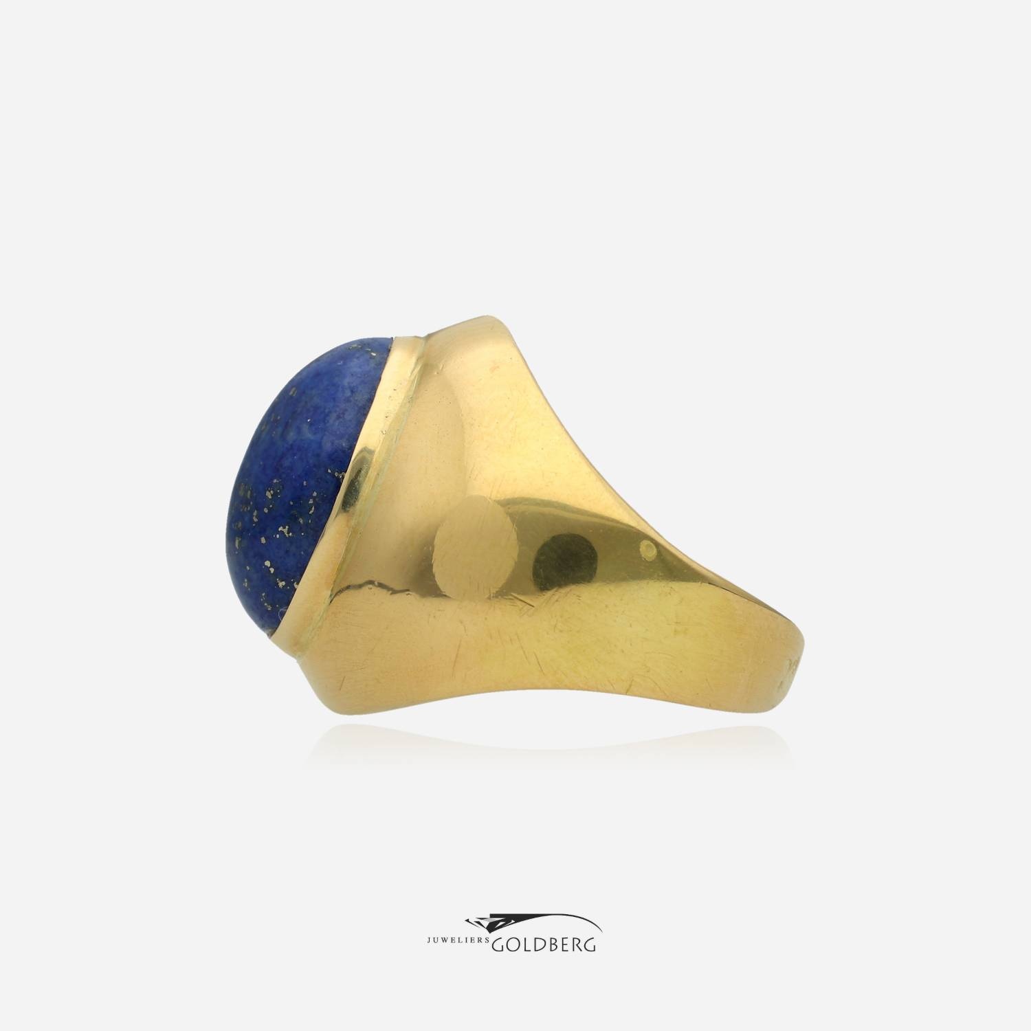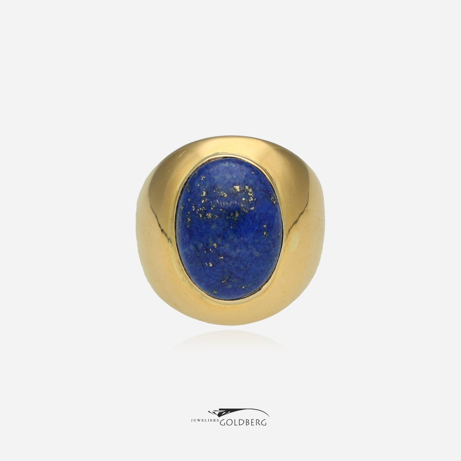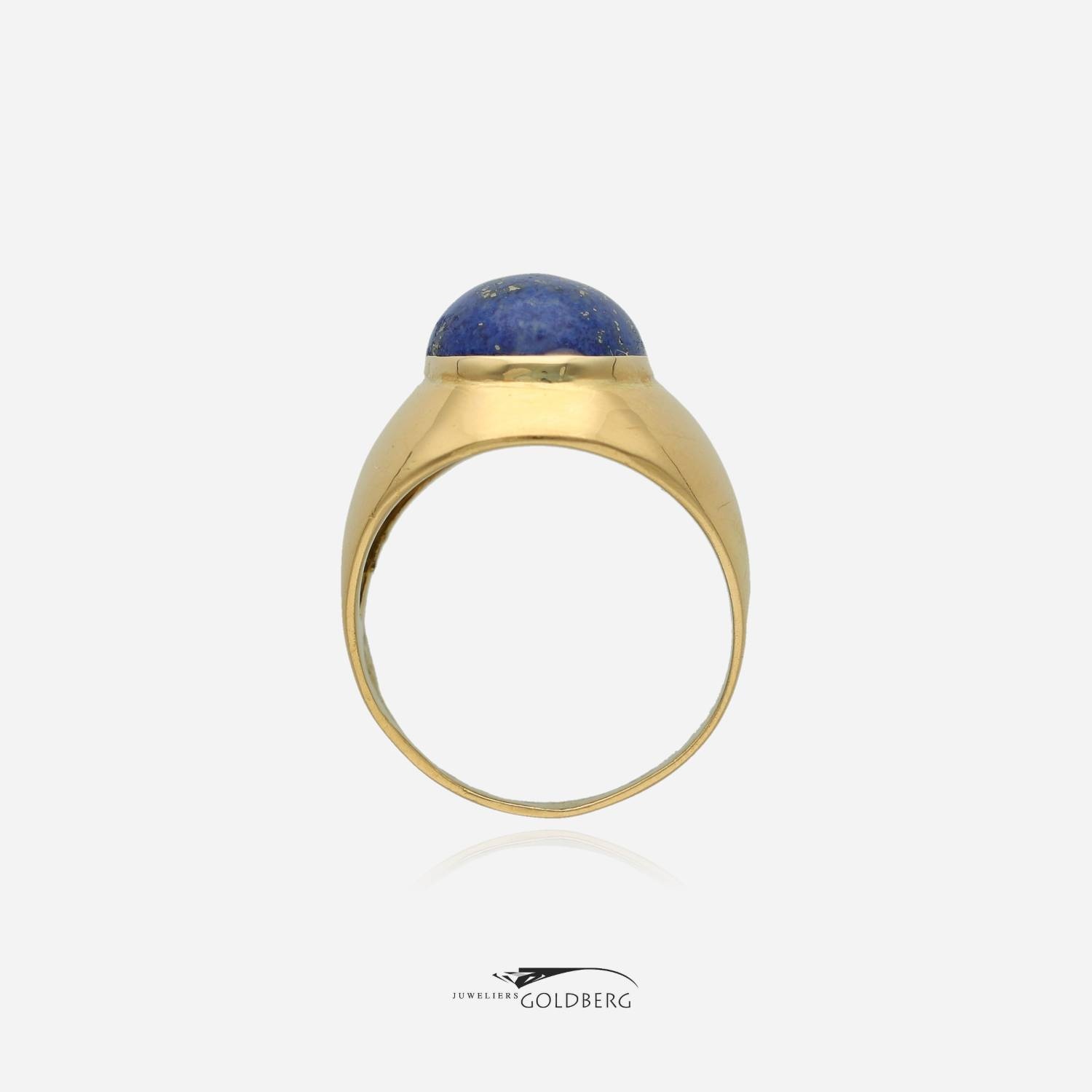 A beautiful 18k gold vintage ring with a large oval cabochon-cut lapis lazuli. The deep, intense blue of the lapis is beautifully complemented by the gold-colored speckles, usually pyrite, giving the ring a unique and timeless look. This ring is approximately 20 mm wide at the top and approximately 4 mm at the bottom. If you are interested in this stunning piece, please feel free to visit us or contact us to discuss the possibilities!
