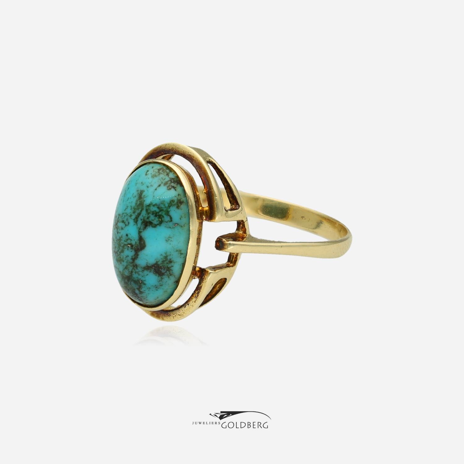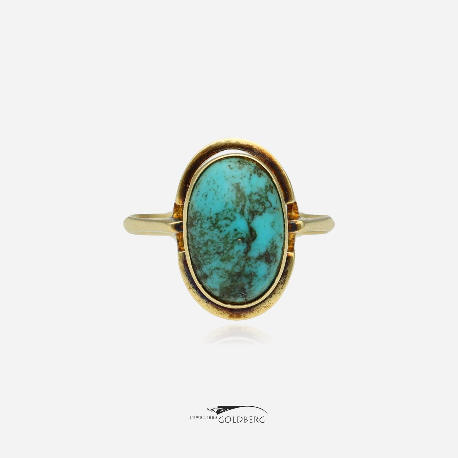 Een mooie klassieke vintage ring van goud met een ovaal cabochon geslepen turkoois. Het ornament heeft een totale afmeting van ca. 15,4 x 10 mm. Deze klassieke ring zorgt met het ontwerp voor een verfijnde uitstraling. De ring is ca. 2 mm breed aan de onderkant in de band. Bent u nou geïnteresseerd in dit prachtsieraad, kom dan gerust langs of neem contact op om de mogelijkheden te bespreken!