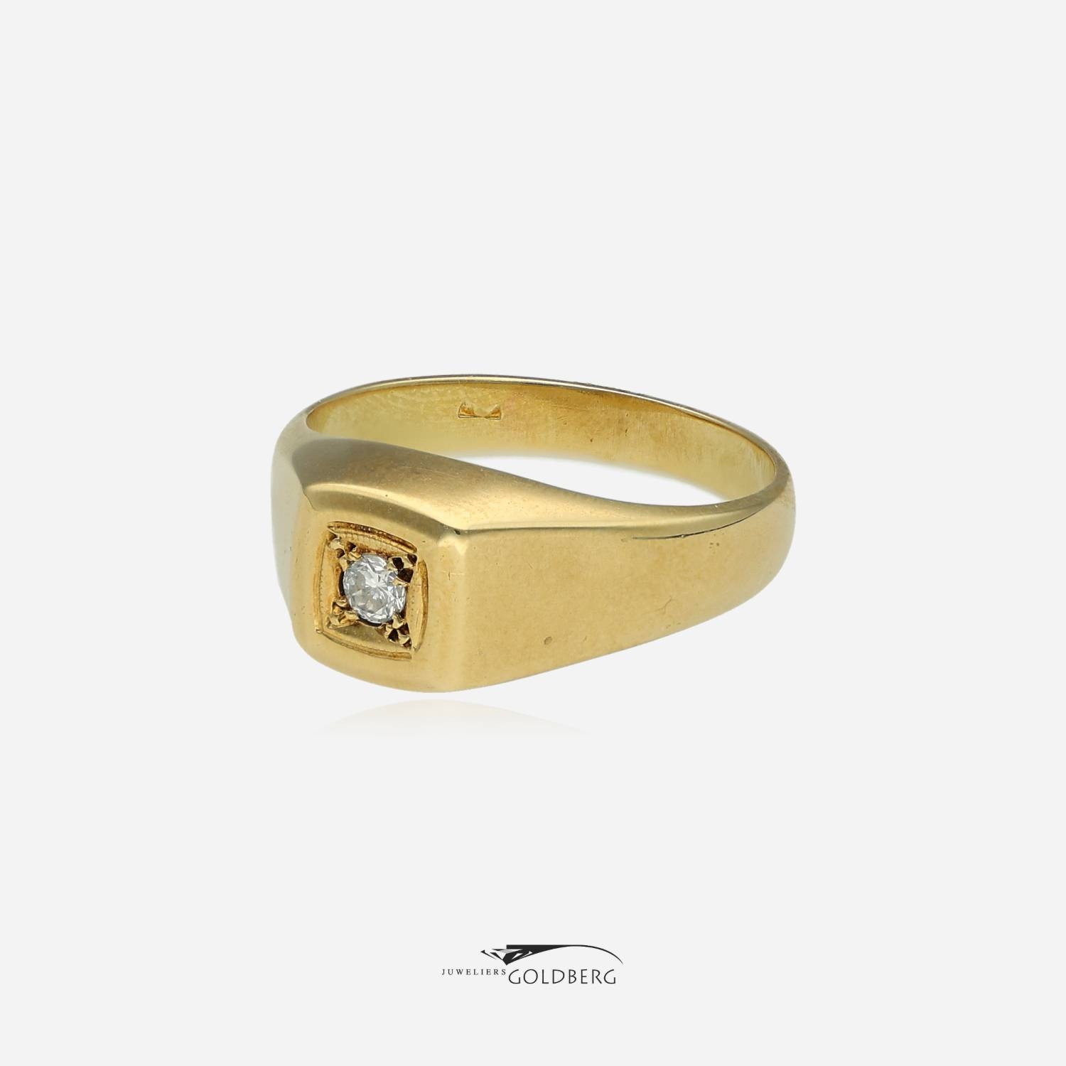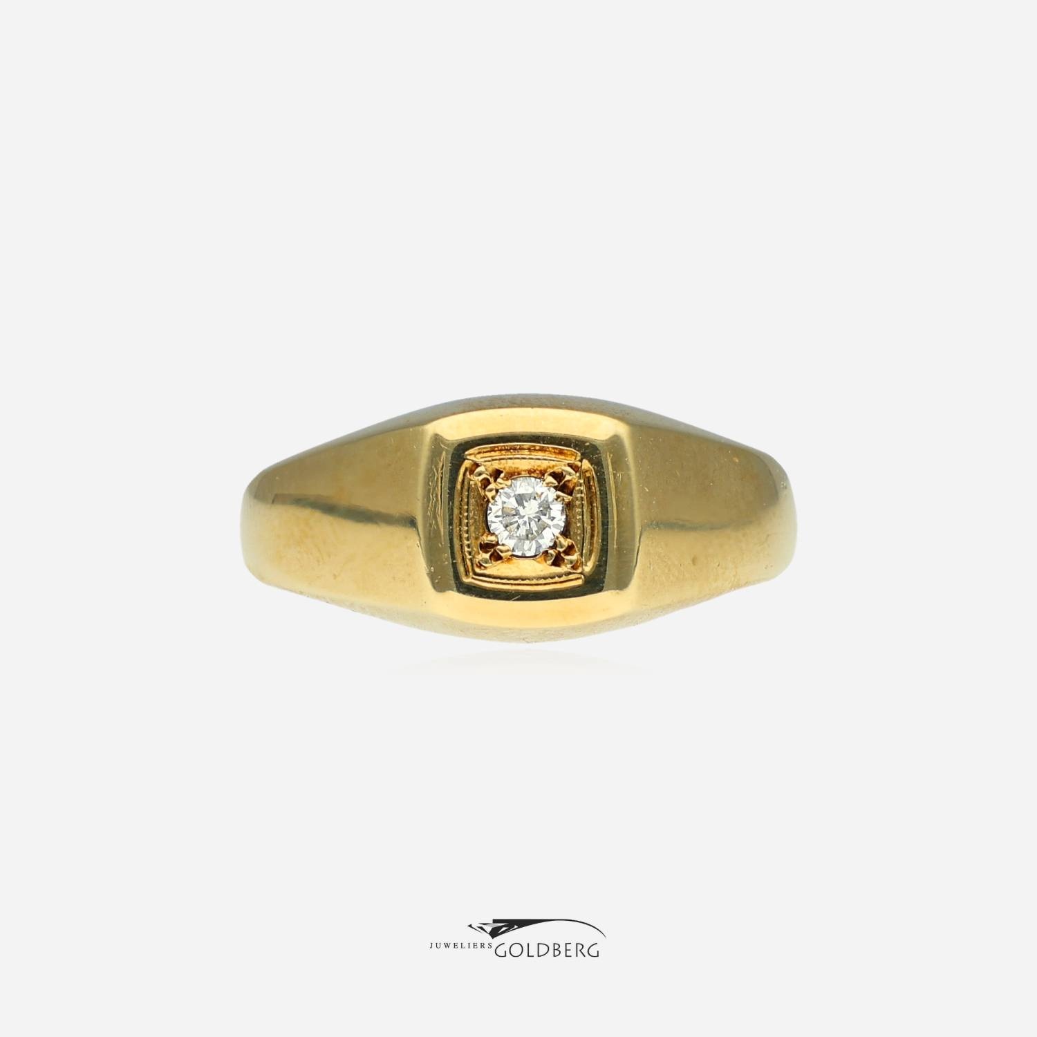 Prachtige klassieke vintage heren-pinkring van 14k goud, bezet met een briljant geslepen diamant van ca. 0.06ct. Deze tijdloze ring straalt elegantie uit dankzij de geornamenteerde zetting, wat zorgt voor een verfijnde en stijlvolle uitstraling. Deze ring is ca. 8,8 mm breed aan de bovenkant en ca. 3 mm aan de onderkant. Bent u nou geïnteresseerd? Kom dan gerust langs of neem contact op om de mogelijkheden te bespreken!