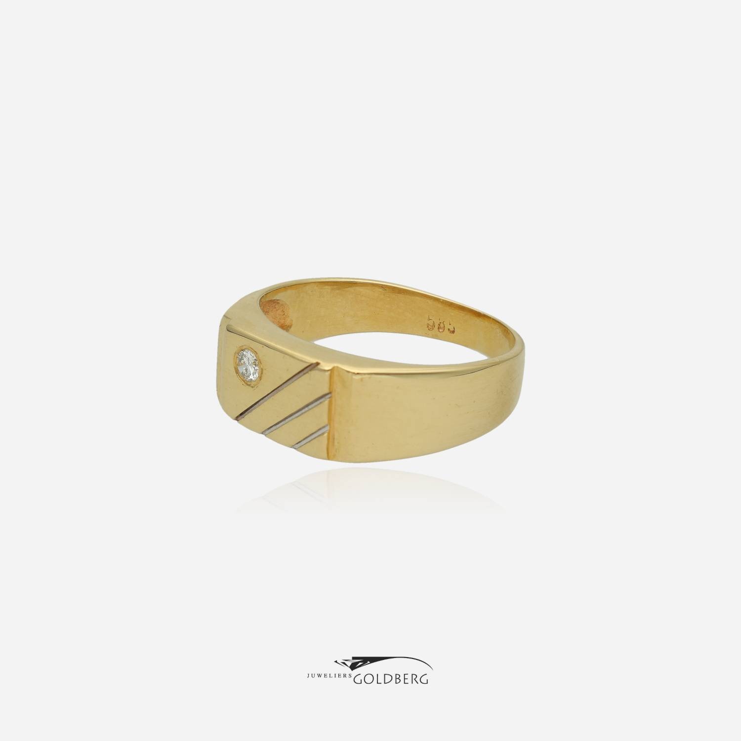 Prachtige klassieke vintage heren-pinkring van 14k goud, bezet met een briljant geslepen diamant van ca. 0.03ct. Deze tijdloze ring straalt elegantie uit dankzij het subtiele reliëf, wat zorgt voor een verfijnde en stijlvolle uitstraling. Deze ring is ca. 6,7 mm breed aan de bovenkant en ca. 2,8 mm aan de onderkant. Bent u nou geïnteresseerd? Kom dan gerust langs of neem contact op om de mogelijkheden te bespreken!
