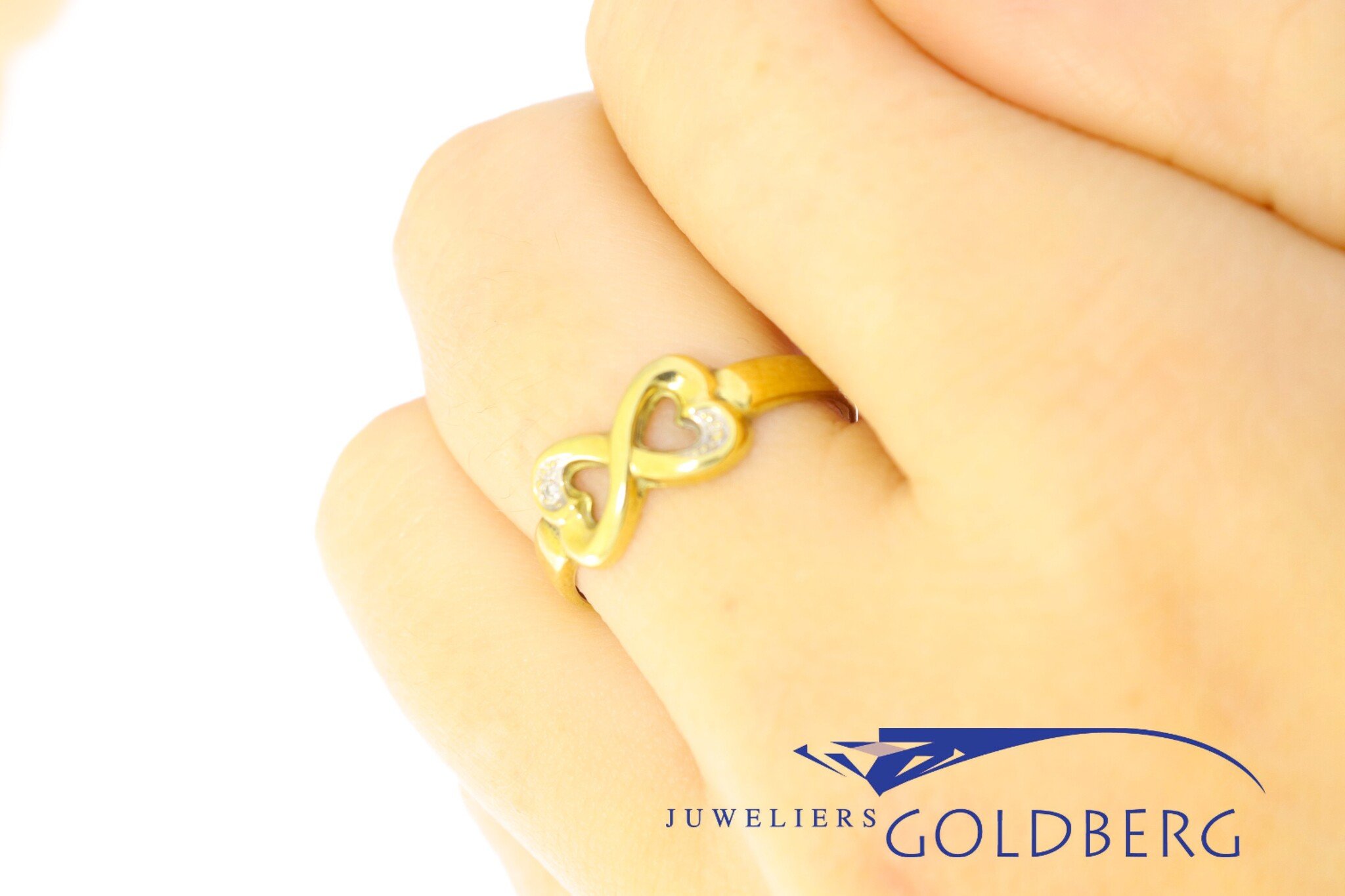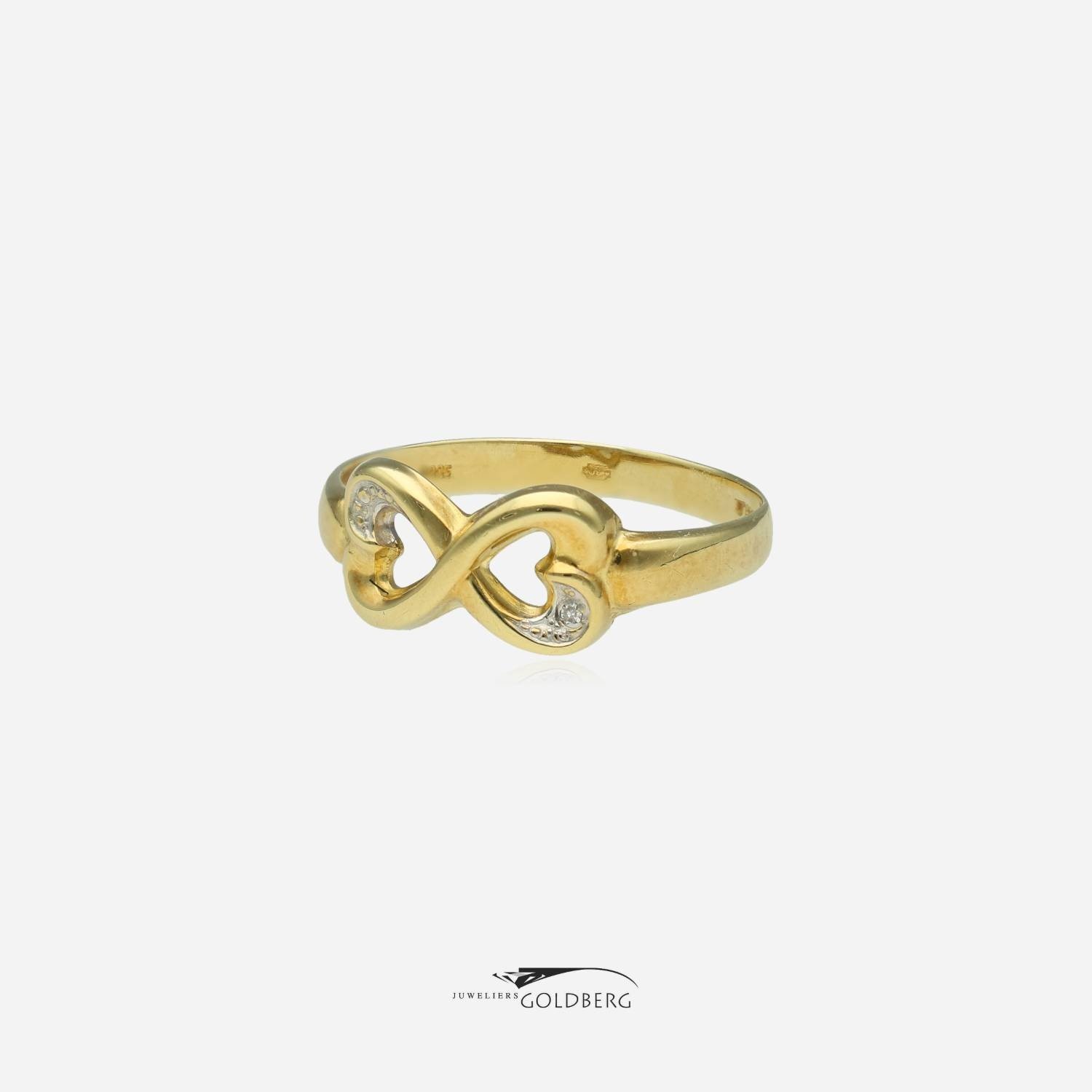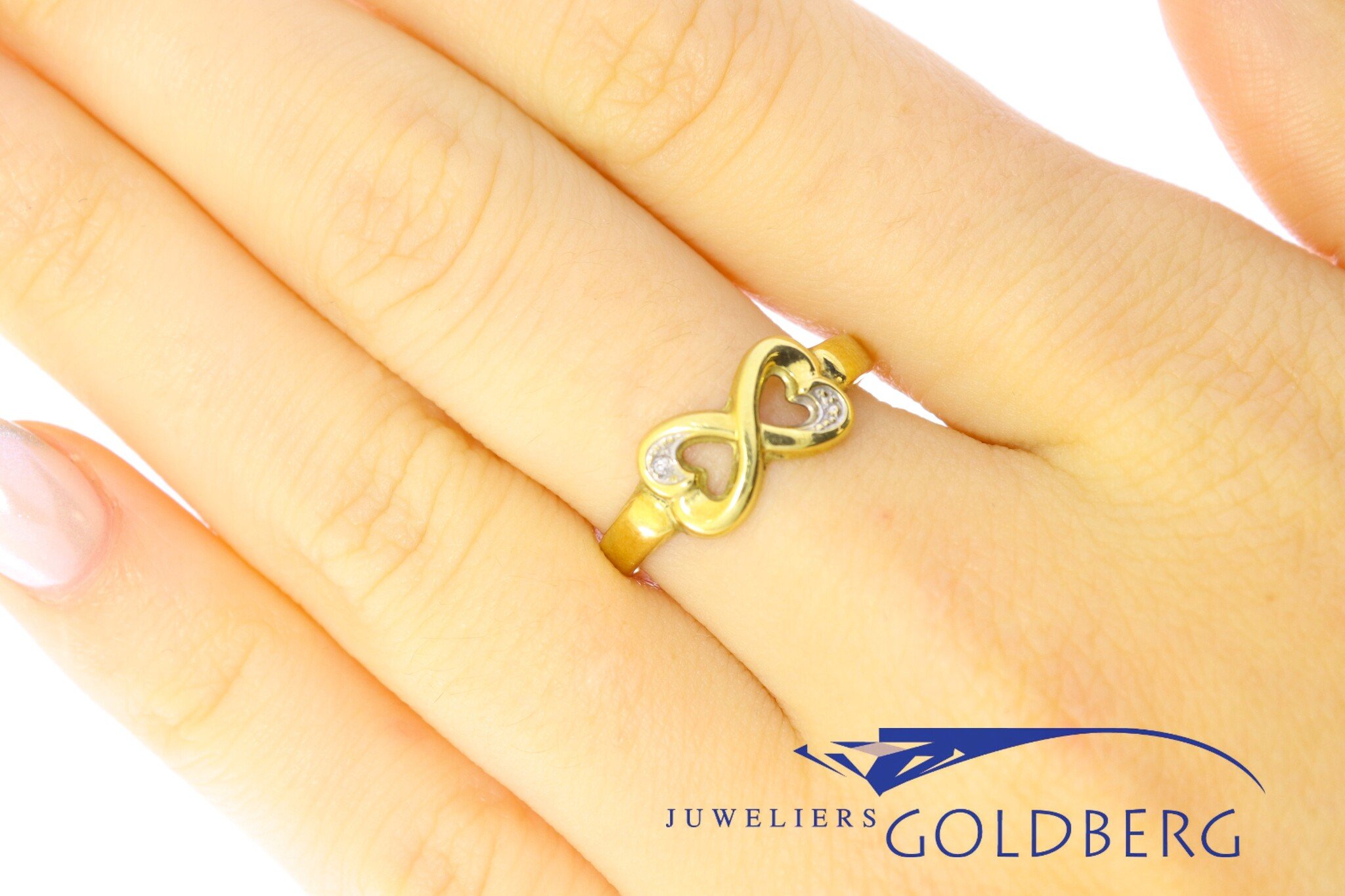 Een prachtige vintage ring van 14k goud met één achtkant geslepen diamant. Het ornament bestaat uit twee harten die samen een lemniscaat (oneindigheidssymbool) vormen, wat de ring een speelse en jeugdige uitstraling geeft en het ontwerp extra bijzonder maakt. Deze ring is ca. 7,3 mm breed aan de bovenkant en ca. 2,3 mm aan de onderkant. Bent u geïnteresseerd in dit prachtige sieraad, kom dan gerust langs of neem contact op om de mogelijkheden te bespreken!
