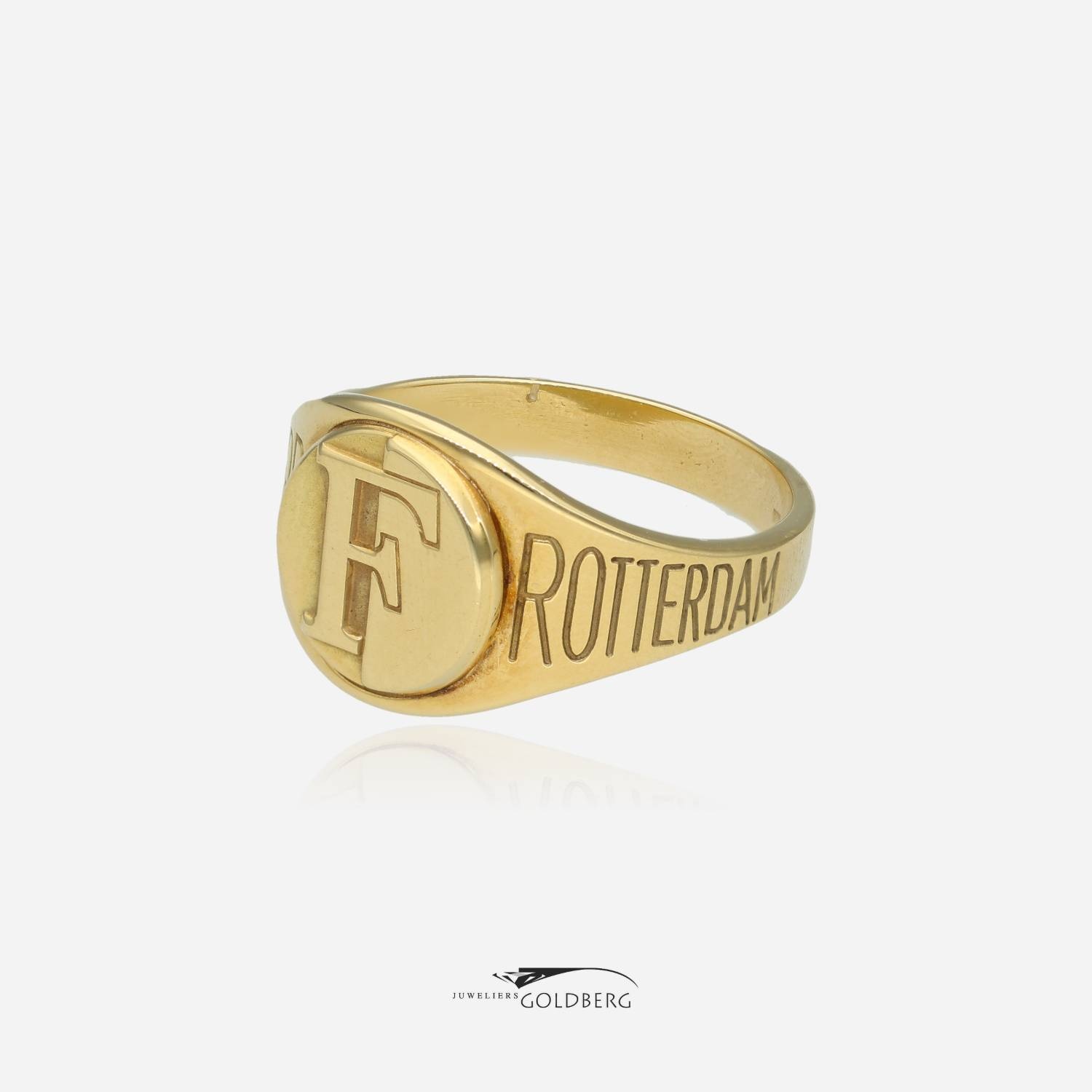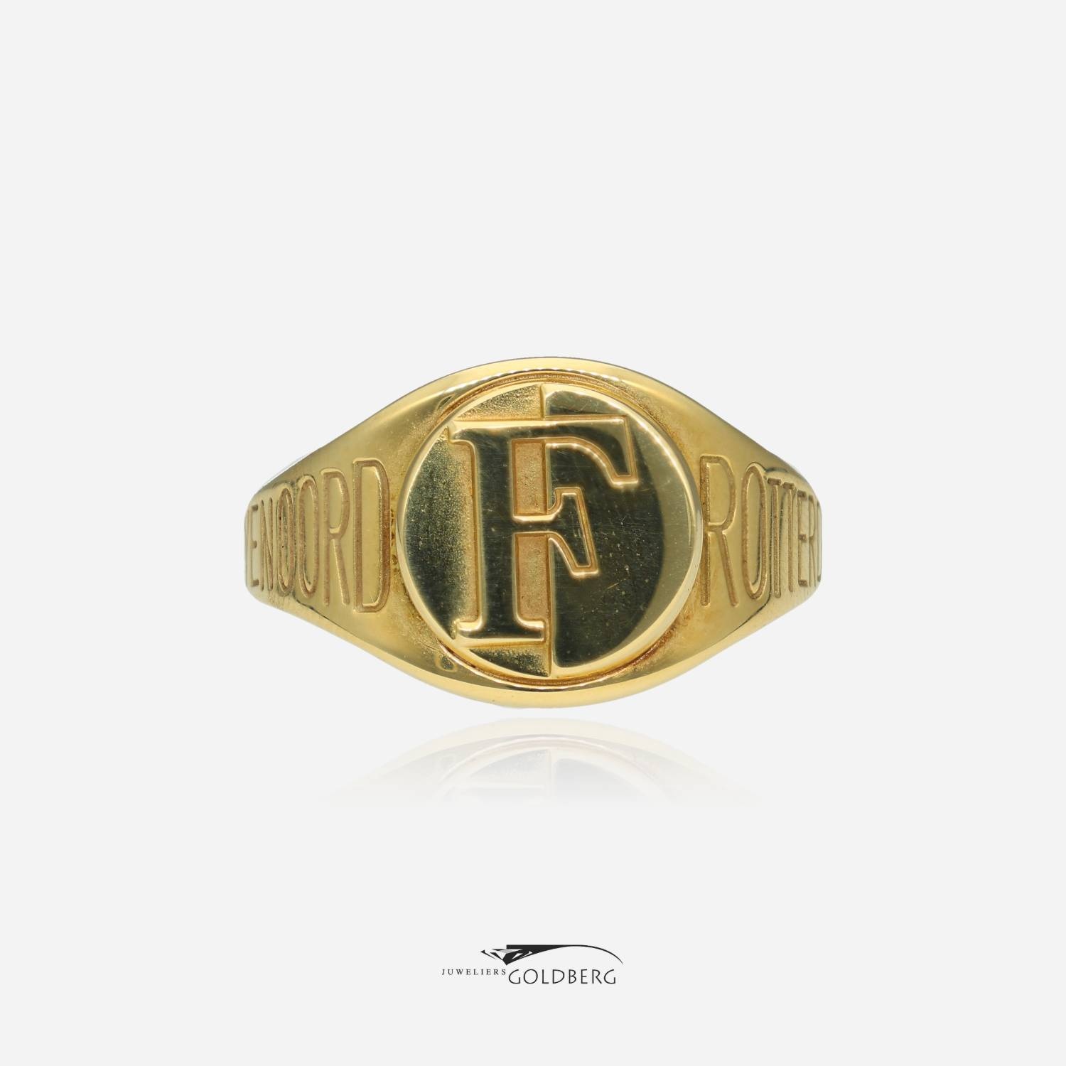 Een geelgouden klassieke vintage zegelring van 14 karaat goud met het Feyenoord logo. Daarnaast op de band aan de linkerzijde de tekst: "Feyenoord" en aan de rechterzijde "Rotterdam." Voor de echte voetbalfan. Deze ring is ca. 13,7 mm breed aan de bovenkant en ca. 3,7 mm aan de onderkant. Bent u nou geïnteresseerd? Kom dan gerust langs of neem contact op om de mogelijkheden te bespreken!