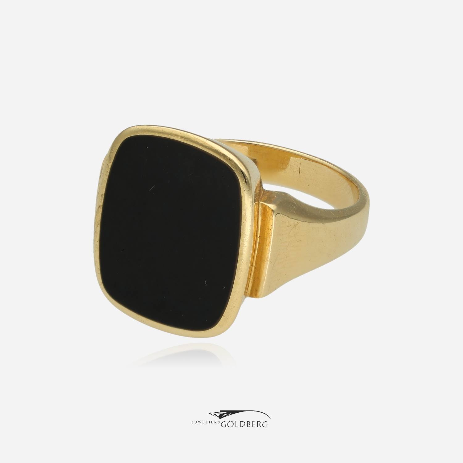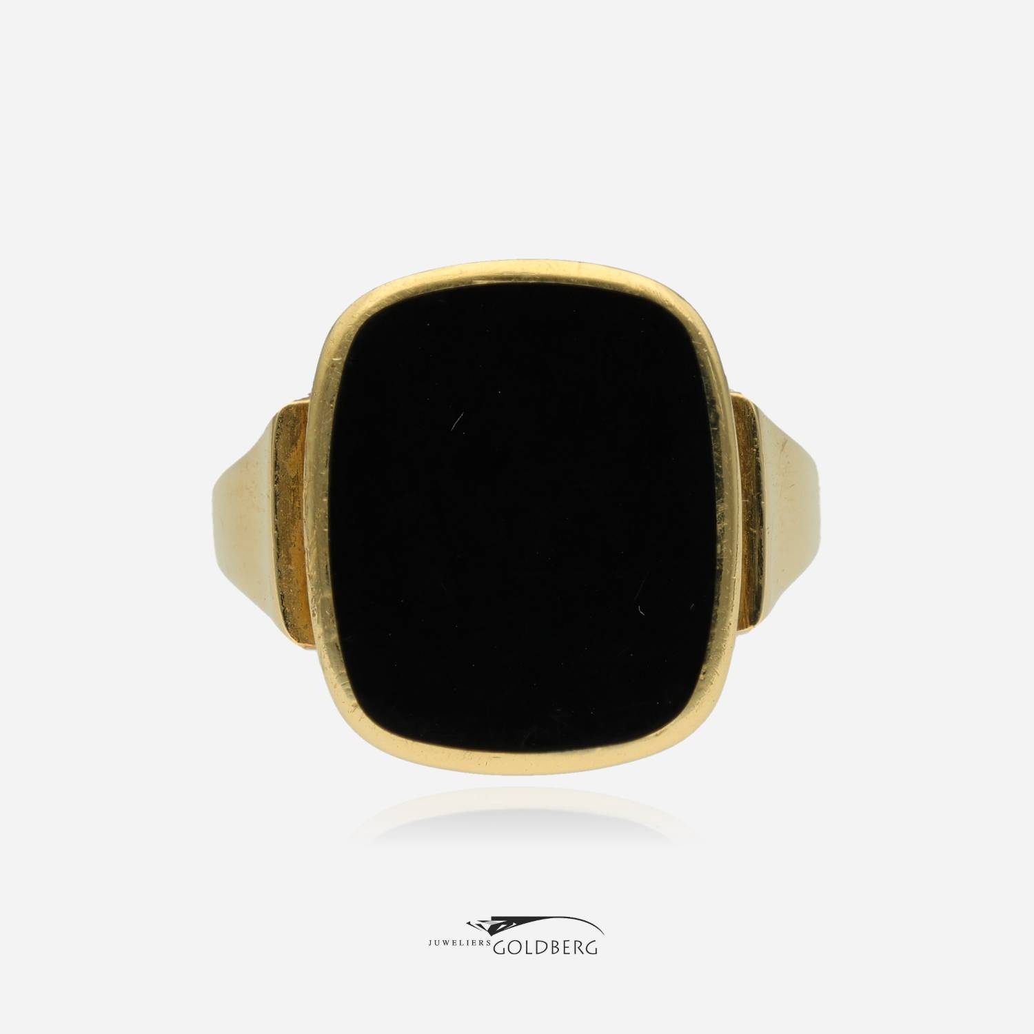 Een prachtige klassieke zegelring bezet met een rechthoekig cabochon geslepen onyx. Het ornament heeft een totale afmeting van 19,3 x 16,4 mm. Deze klassieke ring zorgt met het ontwerp voor een verfijnde uitstraling. Deze ring is ca. 3,8 mm breed aan de onderkant. Bent u nou geïnteresseerd? Kom dan gerust langs of neem contact op om de mogelijkheden te bespreken!