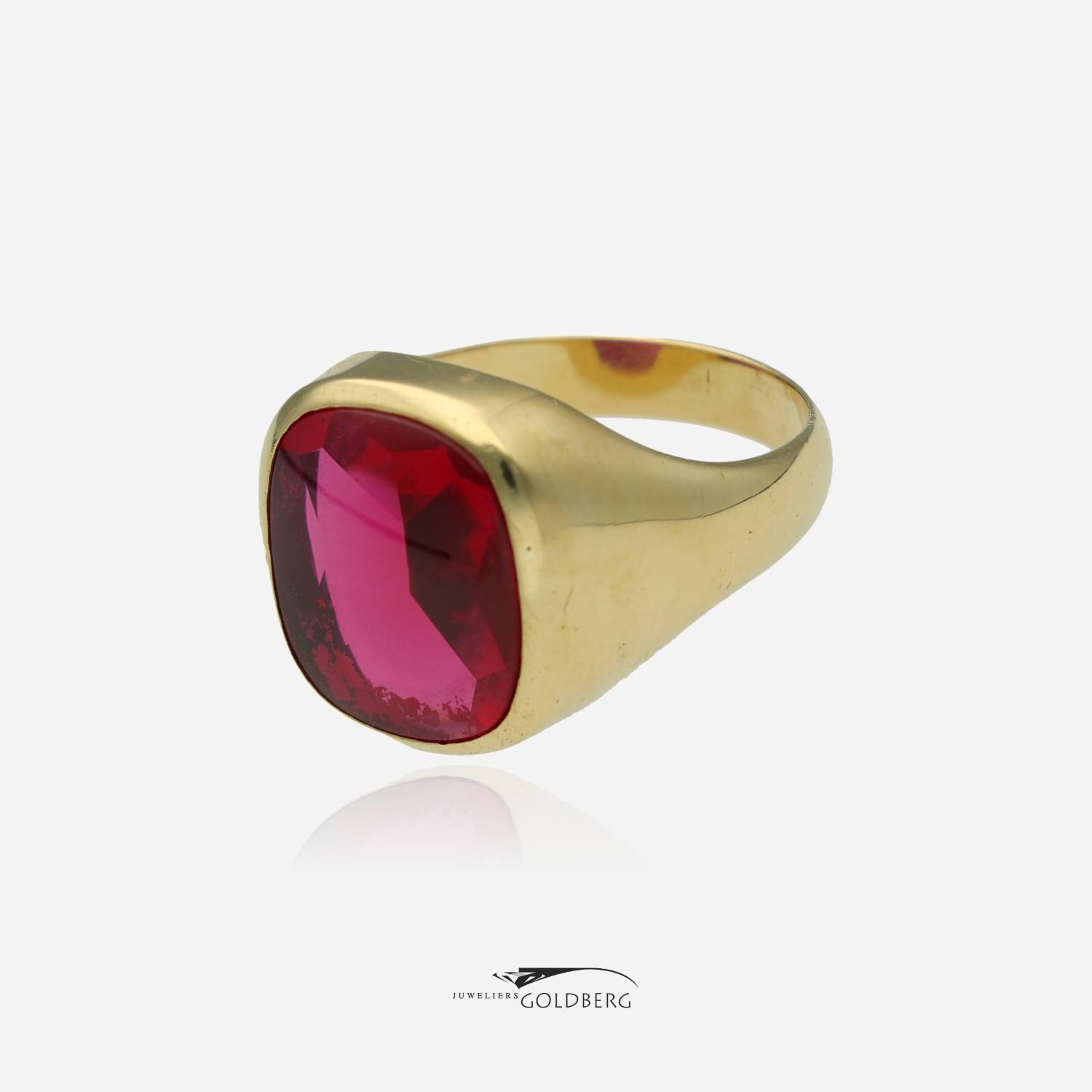 Prachtige klassieke vintage ring van 14k goud bezet met een grote, facet geslepen rode steen. Deze tijdloze ring straalt elegantie uit dankzij het verfijnde ontwerp en de schitterende steen. De minimalistische band zorgt voor een stijlvolle en evenwichtige uitstraling. Deze ring is ca. 17,7 mm breed aan de bovenkant en ca. 4 mm aan de onderkant. Bent u nou geïnteresseerd? Kom dan gerust langs of neem contact op om de mogelijkheden te bespreken!