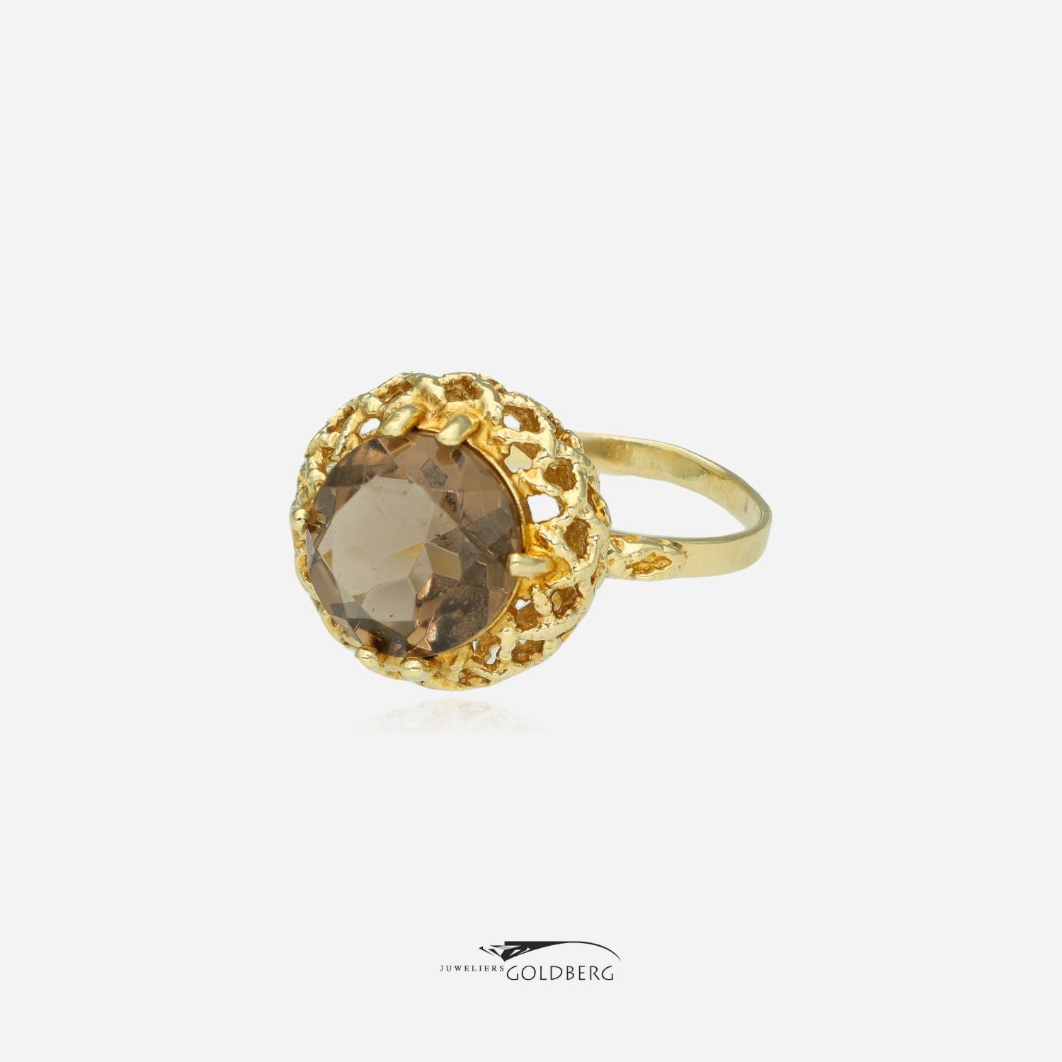 Een prachtige 14k gouden vintage ring, bezet met 1 rond facet geslepen rookkwarts. Met zijn mysterieuze glans en talloze toepassingen in sieraden is rookkwarts, net als amethist, een van de meest begeerde kwartssoorten. De bijzondere ornamentatie van de zetting in combinatie met deze grote rookkwarts maken dit een sieraad met een unieke uitstraling! Deze ring is ca. 14,2 mm breed aan de bovenkant en ca. 1,8 mm aan de onderkant. Bent u nou geïnteresseerd in dit prachtsieraad, kom dan gerust langs of neem contact op om de mogelijkheden te bespreken!