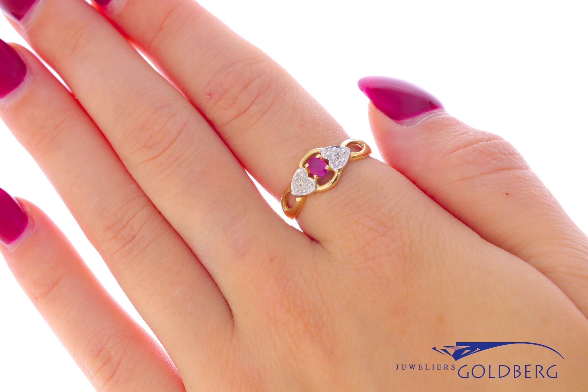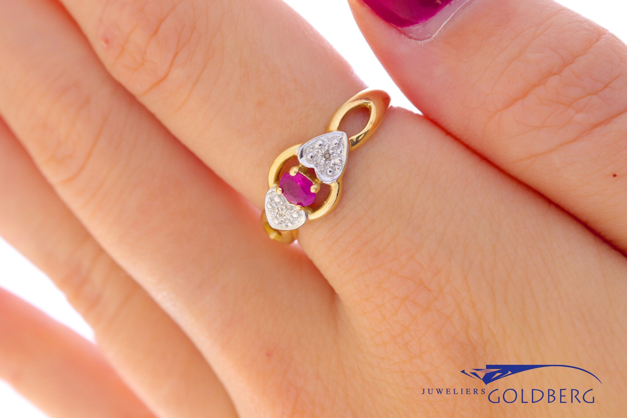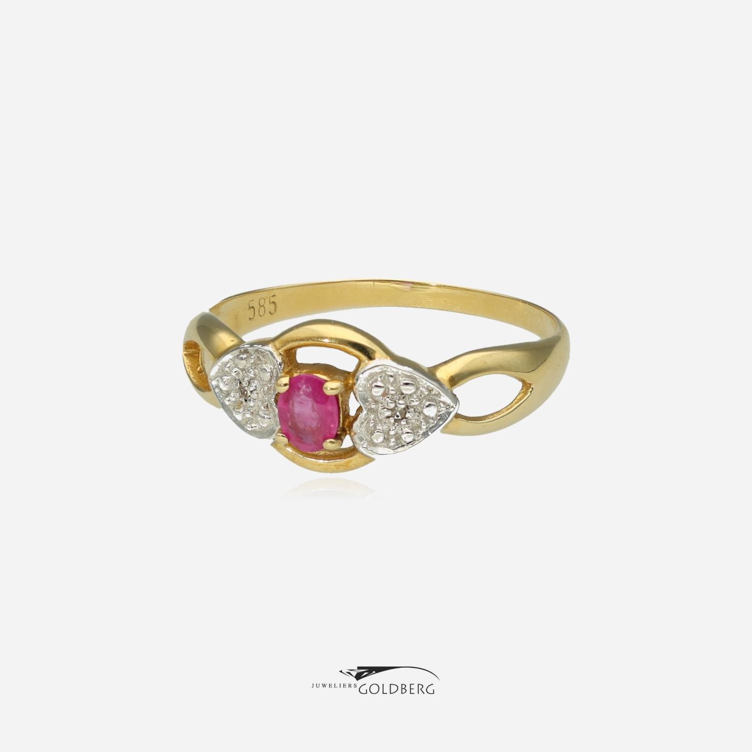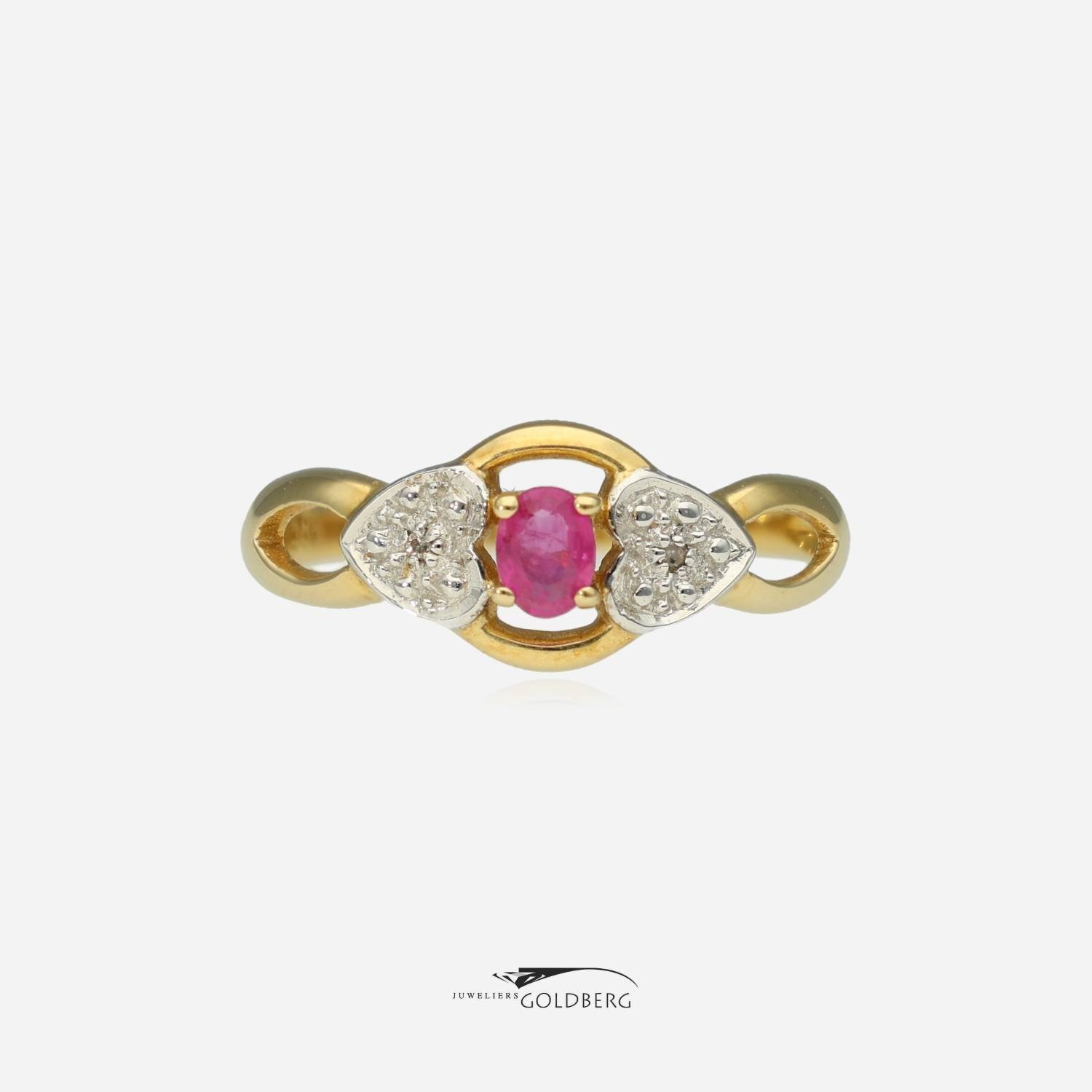 Een prachtige gouden vintage ring met één ovaal geslepen robijn van ca. 4,1x3,2mm en twee achtkant geslepen diamanten met een totaalgewicht van 0.01ct. Deze fantasiering heeft een jonge en speelse uitstraling door de kleur van de robijn in combinatie met aan beide zijdes de hartjes bezet met diamant. Deze ring heeft een breedte van ca. 8mm aan de bovenkant en een band breedte van ca. 1,6mm aan de onderkant.