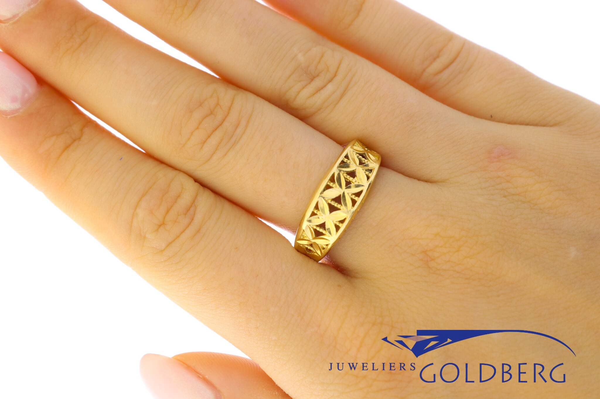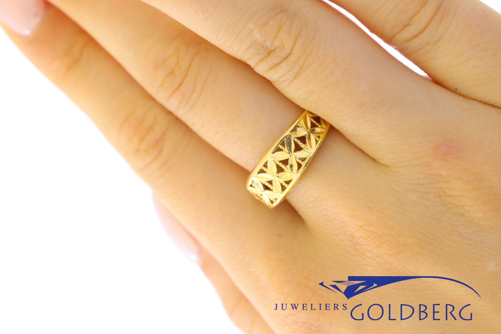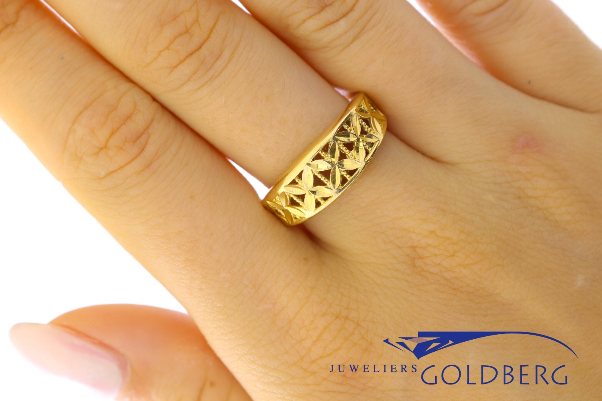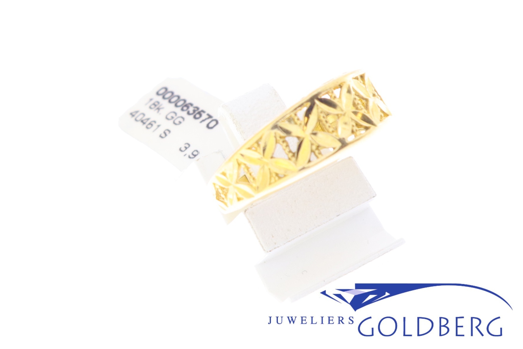 Een prachtige Lorenzo Ungari ring van 18k geelgoud, uit de Scintille-collectie van sieradenmerk Lorenzo Ungari. Lorenzo Ungari is een Italiaans sieradenmerk dat bekend staat om zijn hoogwaardige vakmanschap en innovatieve ontwerpen. Het bedrijf is gevestigd in Arezzo, Italië, en biedt een breed scala aan sieraden. De Scintille-collectie omvat diverse sieraden, zoals ringen, armbanden en hangers, die opvallen door hun unieke vormgeving en hoogwaardige afwerking. Deze ring is ca. 7,8 mm breed aan de bovenkant en ca. 2 mm aan de onderkant. Bent u nou geïnteresseerd, kom dan gerust langs of neem contact op om de mogelijkheden te bespreken!