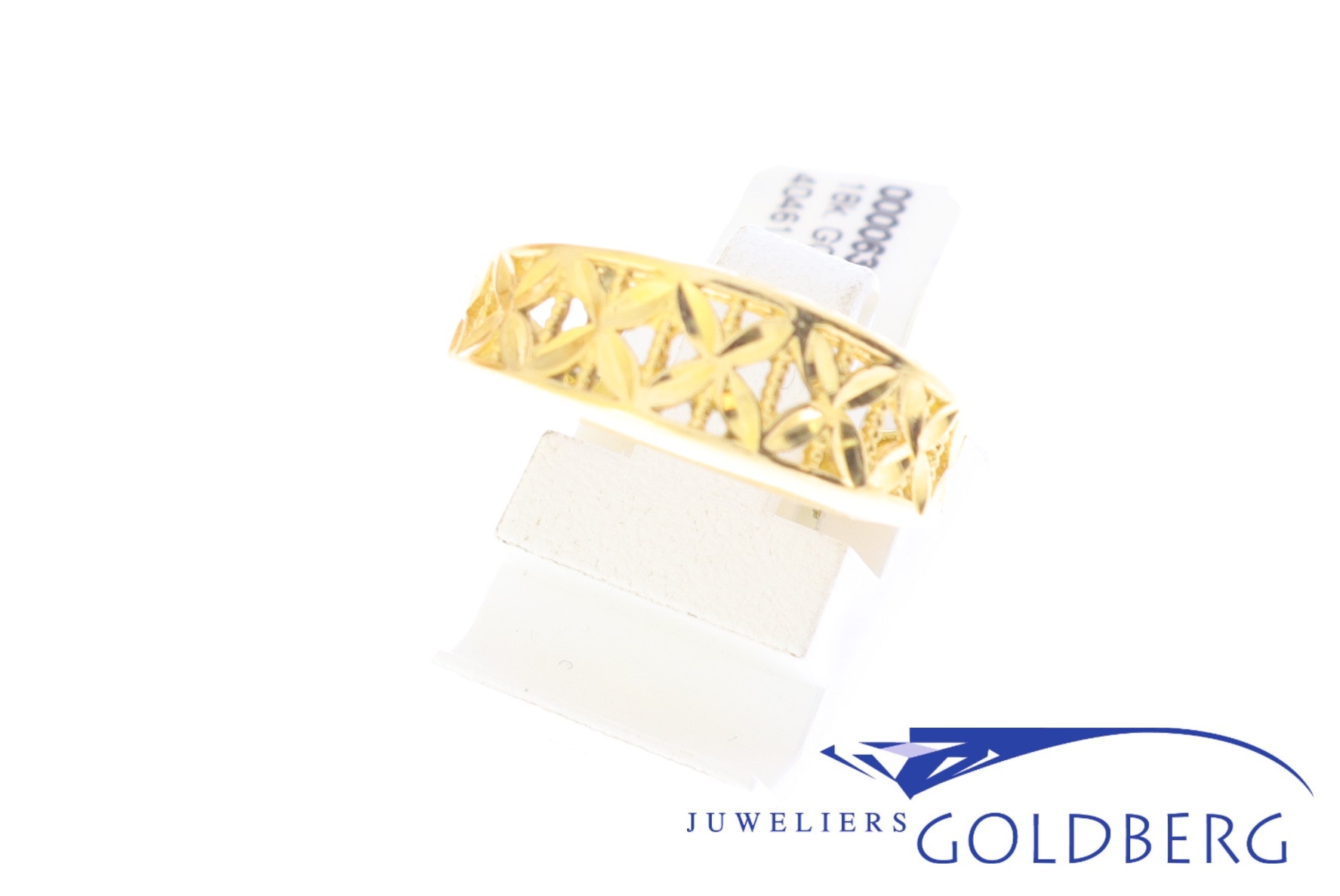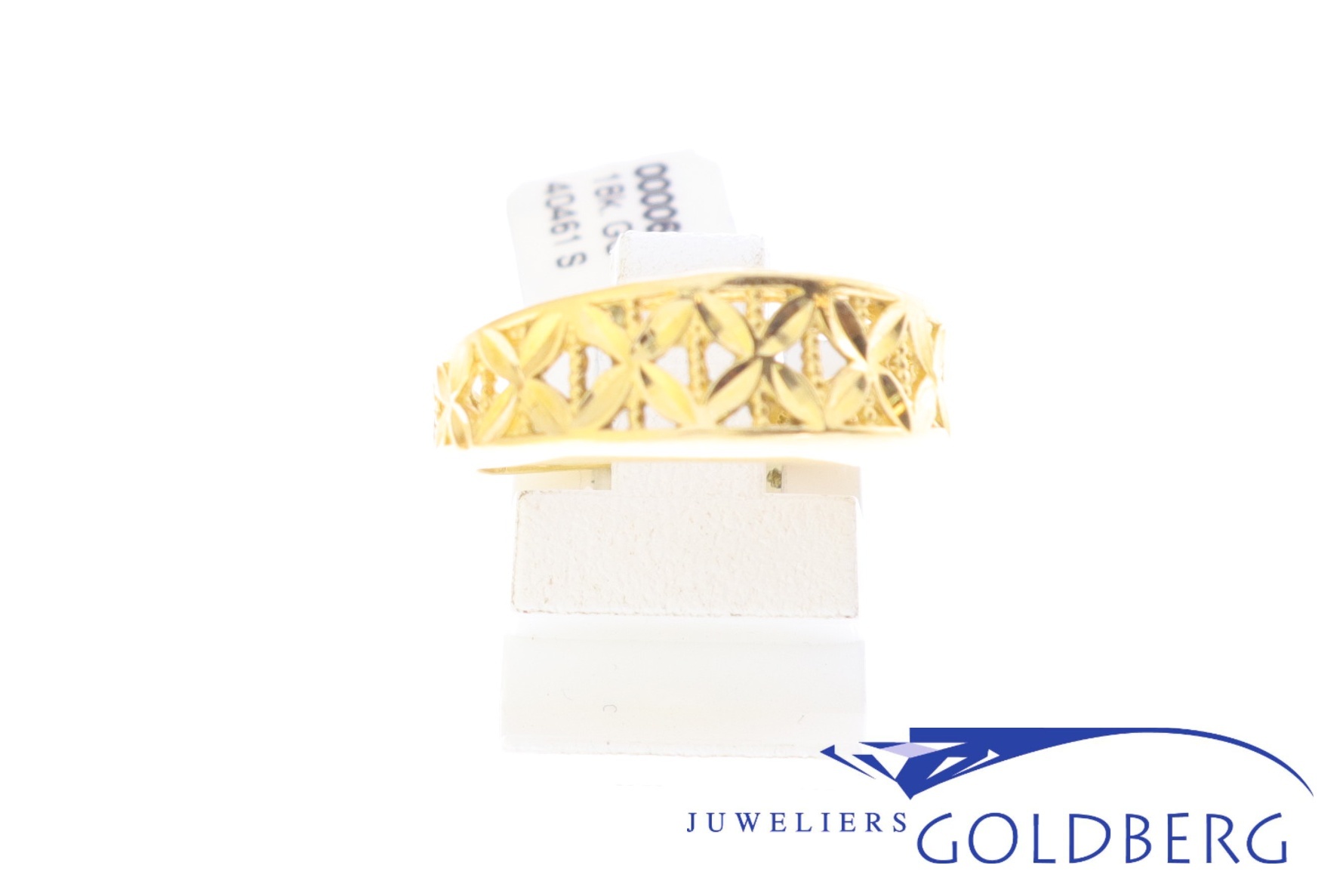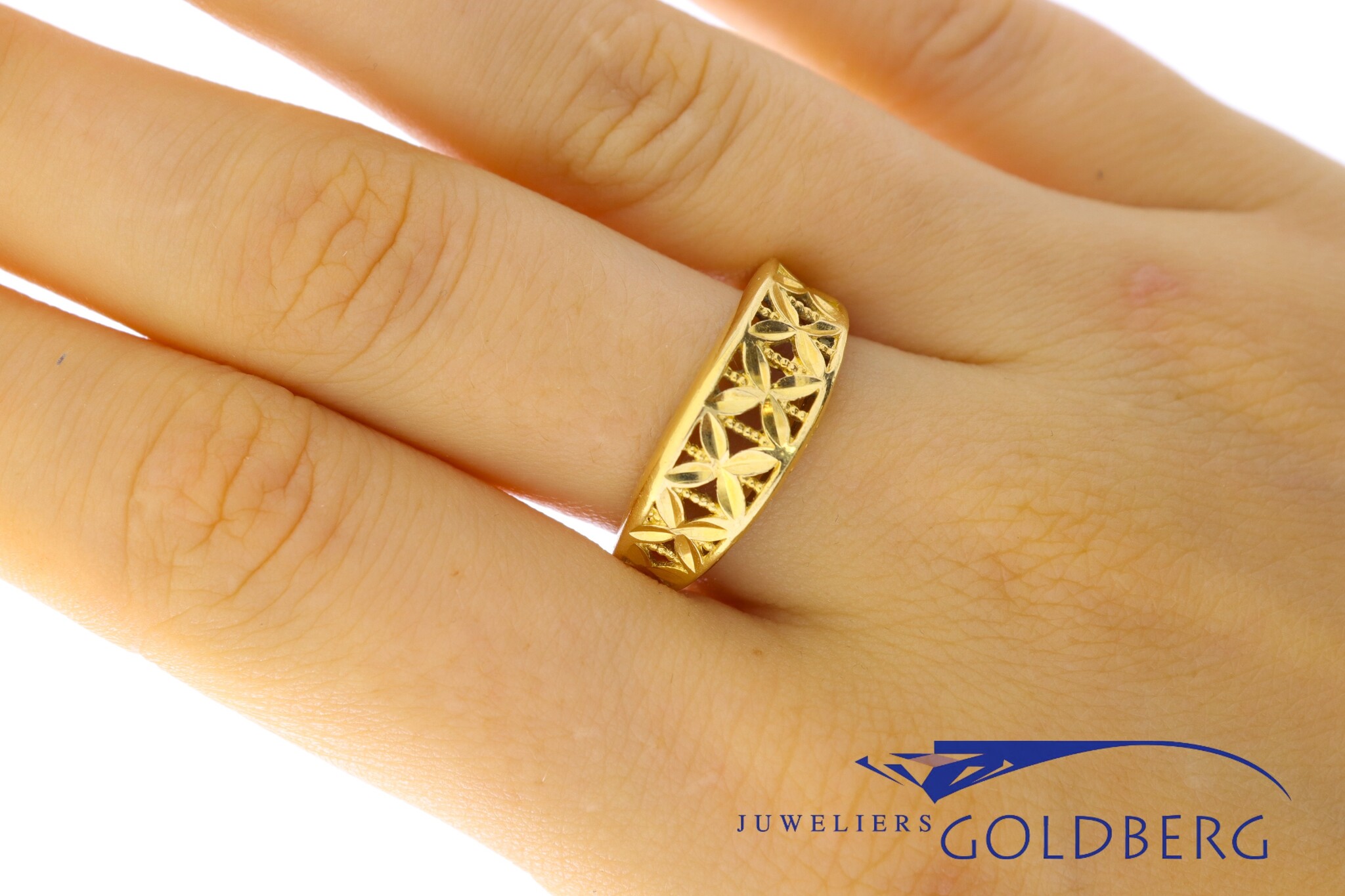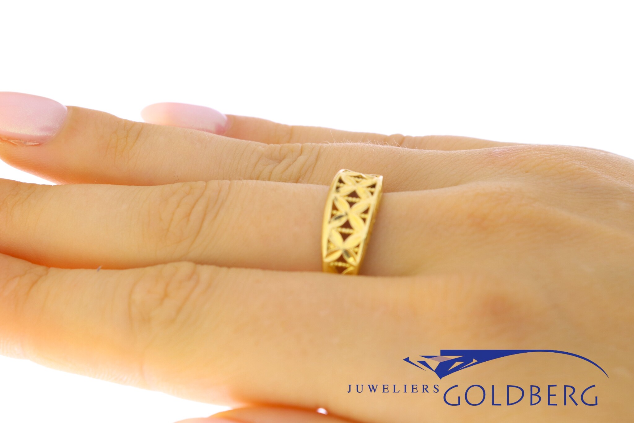 Een prachtige Lorenzo Ungari ring van 18k geelgoud, uit de Scintille-collectie van sieradenmerk Lorenzo Ungari. Lorenzo Ungari is een Italiaans sieradenmerk dat bekend staat om zijn hoogwaardige vakmanschap en innovatieve ontwerpen. Het bedrijf is gevestigd in Arezzo, Italië, en biedt een breed scala aan sieraden. De Scintille-collectie omvat diverse sieraden, zoals ringen, armbanden en hangers, die opvallen door hun unieke vormgeving en hoogwaardige afwerking. Deze ring is ca. 7,8 mm breed aan de bovenkant en ca. 2 mm aan de onderkant. Bent u nou geïnteresseerd, kom dan gerust langs of neem contact op om de mogelijkheden te bespreken!