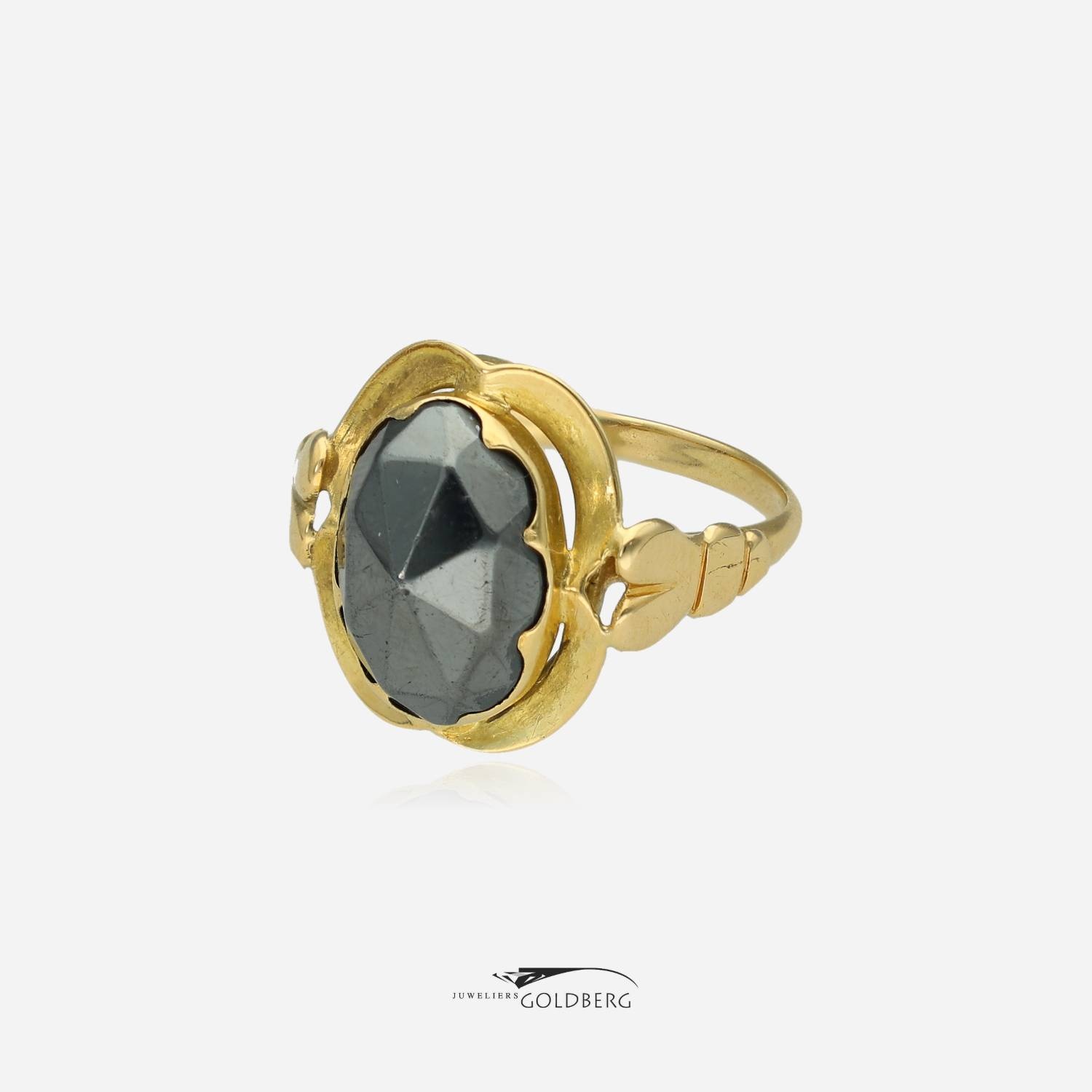 Een prachtige vintage ring van 14k geelgoud met een ovaal facet geslepen grijze hematiet. De combinatie van het warme geelgoud en de donkere hematiet zorgt voor een uitgesproken vintage uitstraling met een stoer en karaktervol ontwerp. Deze ring is ca. 16 mm breed aan de bovenkant en ca. 2 mm aan de onderkant.