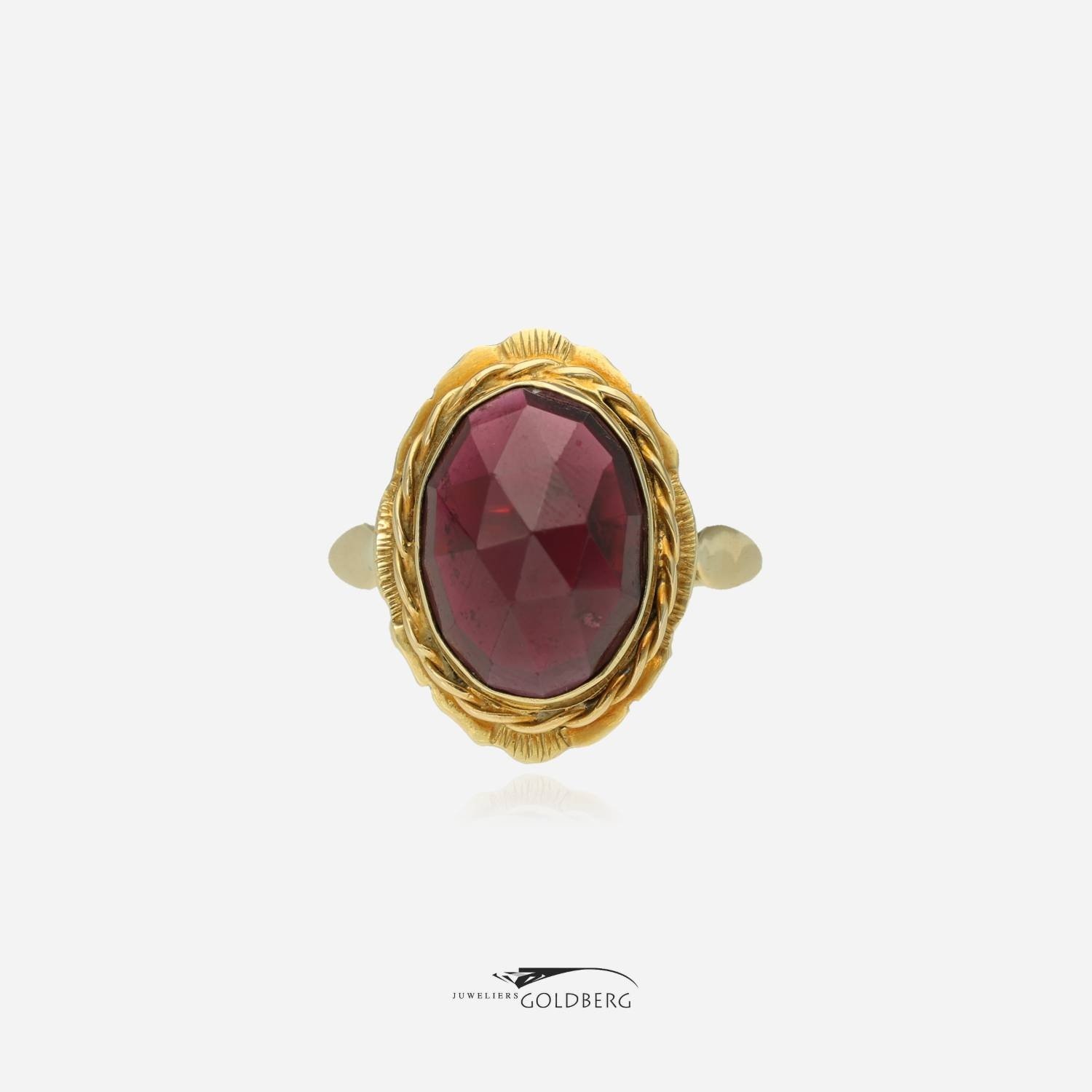 Een klassieke 14k gouden vintage ring bezet met een ovaal facet geslepen granaat. Deze granaat heeft een prachtige dieprode kleur met een vleugje paars. In combinatie met de sierlijke zetting is het een echt juweeltje. Deze ring is ca. 19,8 mm breed aan de bovenkant en ca. 1,7 mm aan de onderkant. Bent u nou geïnteresseerd in dit pracht sieraad, kom dan gerust langs of neem contact op om de mogelijkheden te bespreken!