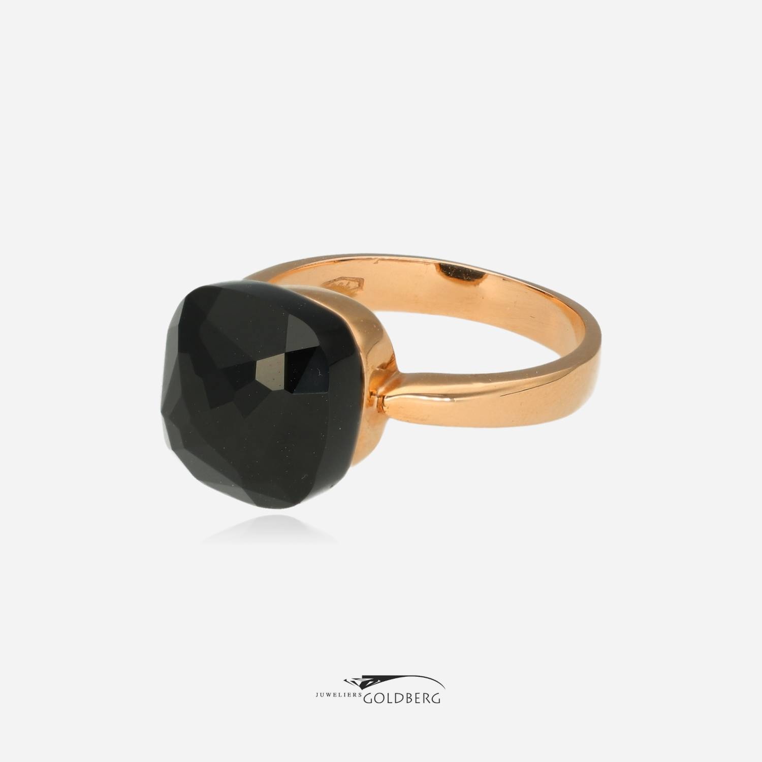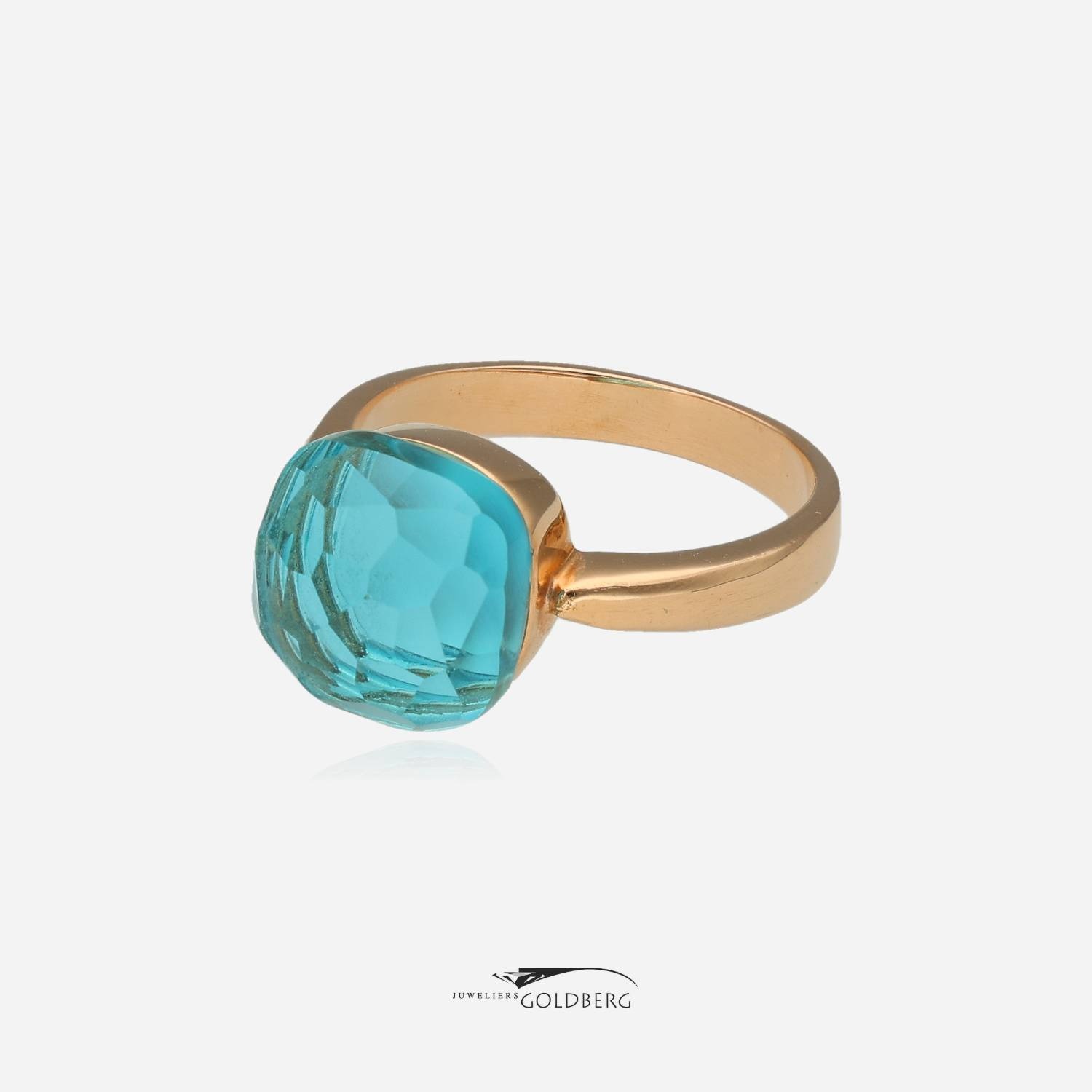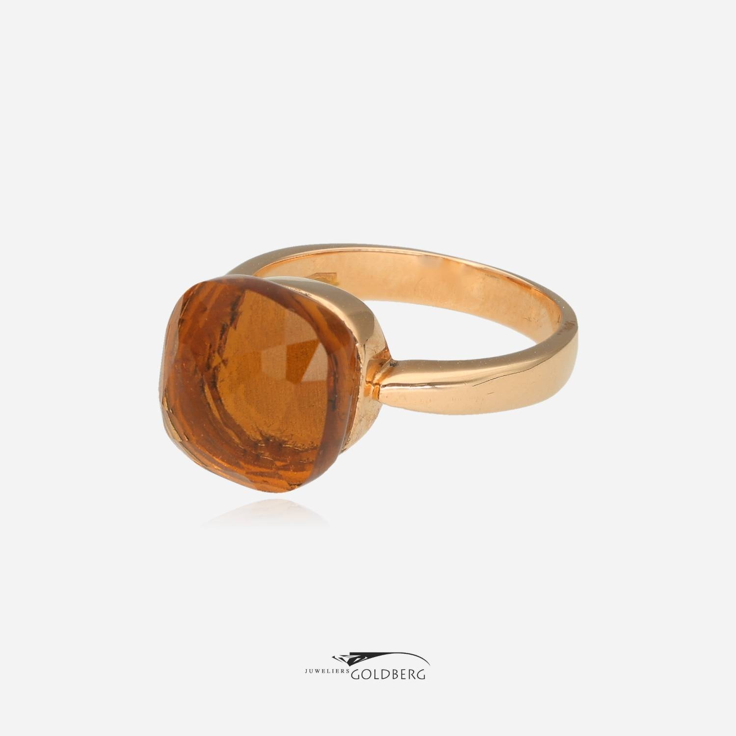 Een prachtige 18 karaat gouden design ring in "Pomellato-stijl" met een facet geslepen kleursteen. Deze ring is ca. 10 mm breed aan de bovenkant en ca. 3 mm aan de onderkant. Bent u nou geïnteresseerd in dit prachtsieraad, kom dan gerust langs of neem contact op om de mogelijkheden te bespreken!